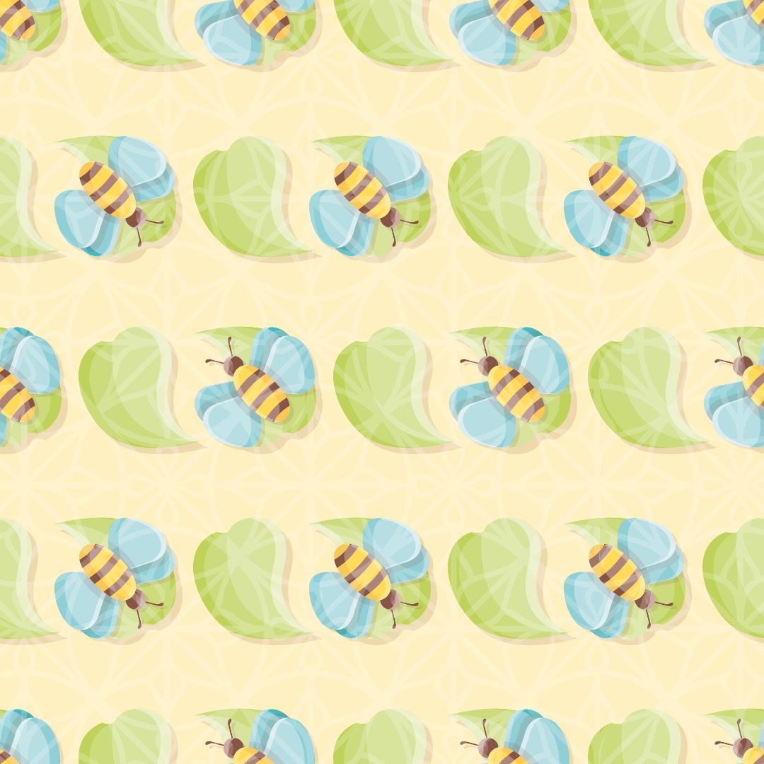 Cute bees over leaves vector repeat pattern. Simple bug illustration background.