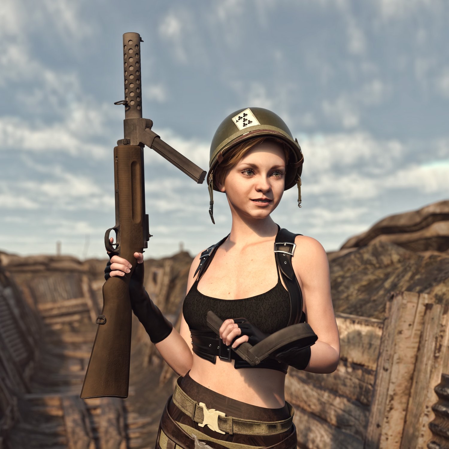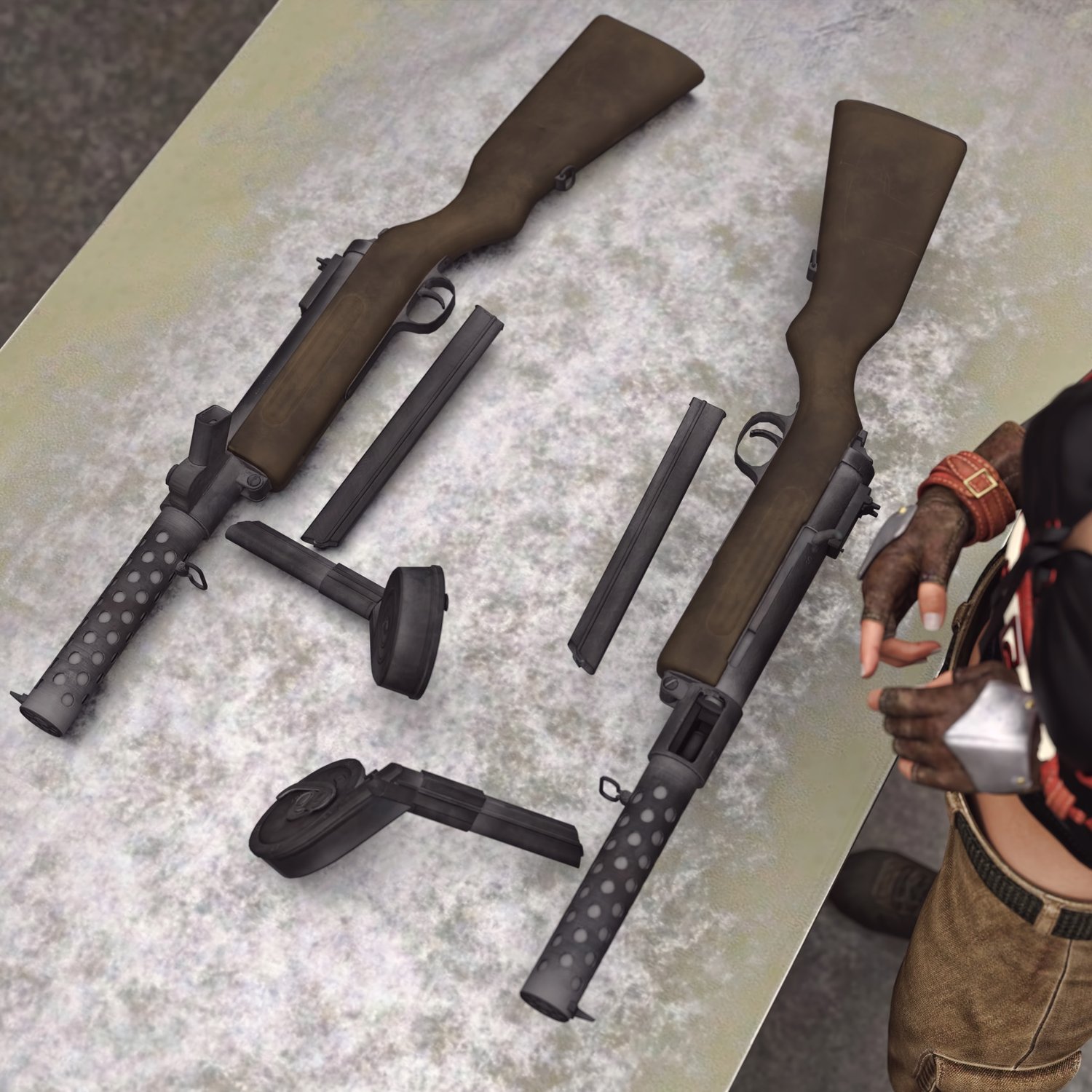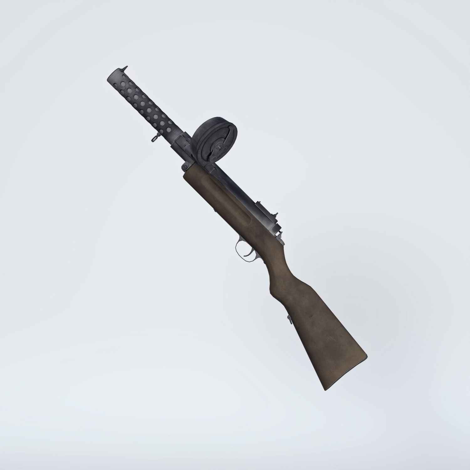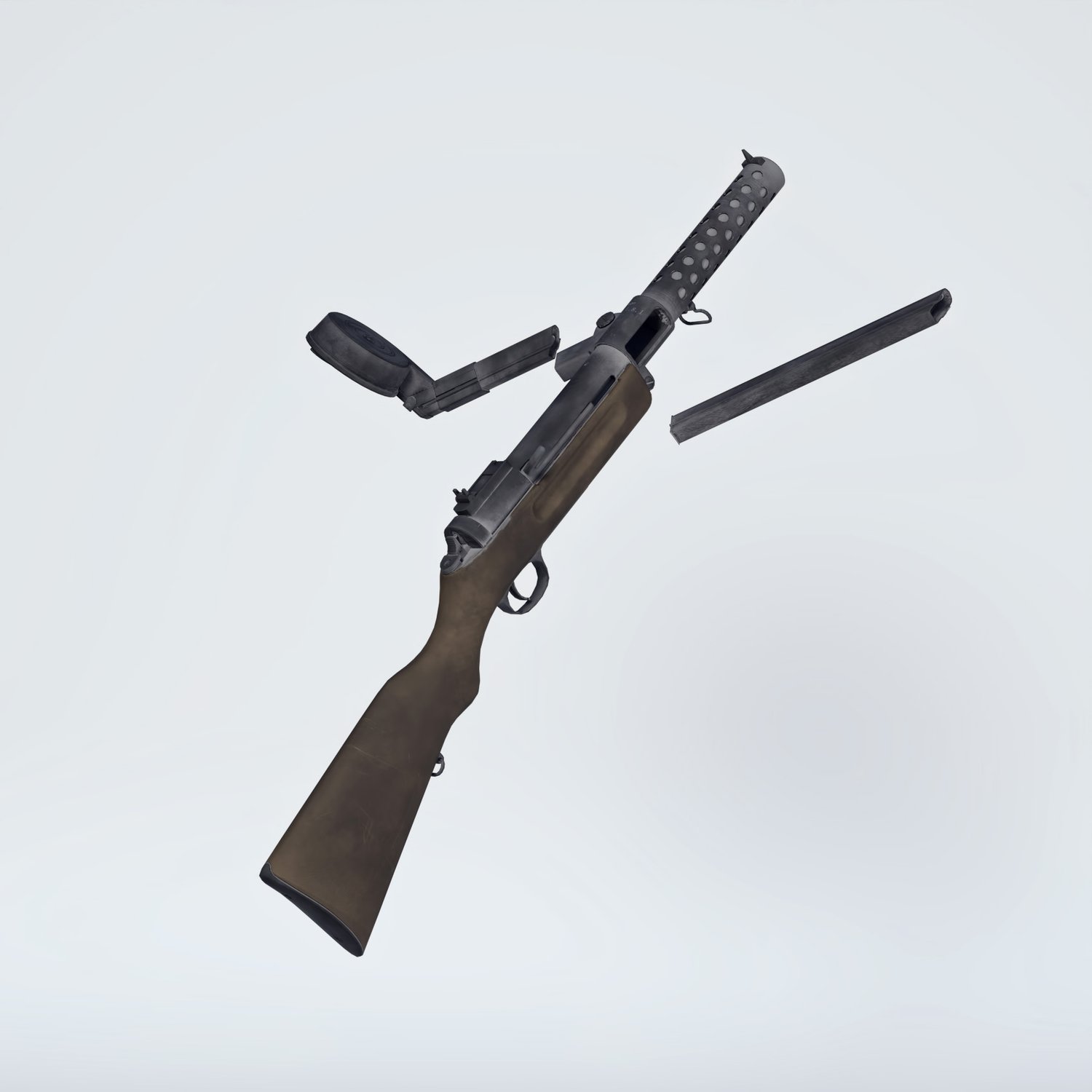 One of the first submachine guns. Developed at the end of WW1 to clean trenches, it didn't have substantial use, but when it was- it was a much greater firepower than a pistol. Influenced a lot of designs of SMGs by WW2. The prop is rigged and converted for use with DAZ. Trigger, safety, bolt etc also rigged for more realistic pictures.