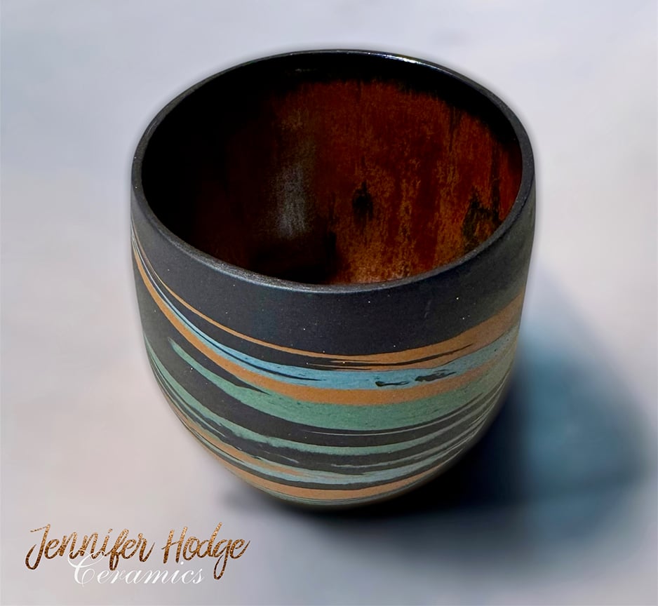 Wheel thrown Neriage stoneware. Hand coloured clay with ancient copper glaze inside. As every cup is unique they will vary slightly but colours can be replicated mostly.