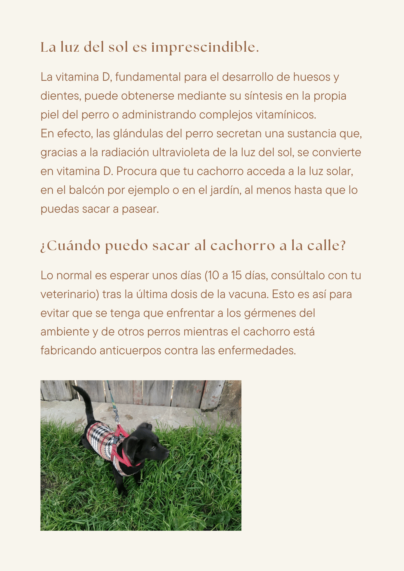 - Salud y prevención: calendario de vacunas, desparasitación interna y externa, señales de alerta y cuándo acudir al veterinario.
