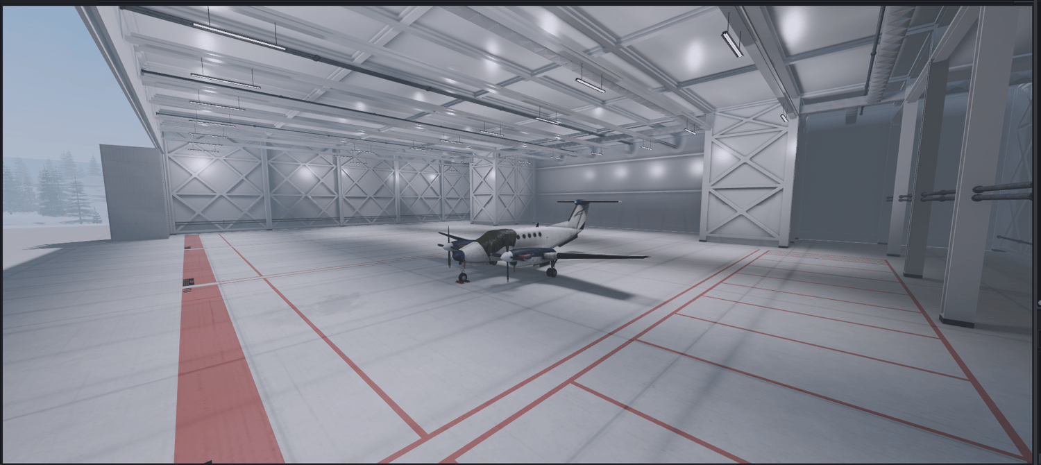- Aircraft hangar with interior lighting, floor markings, etc