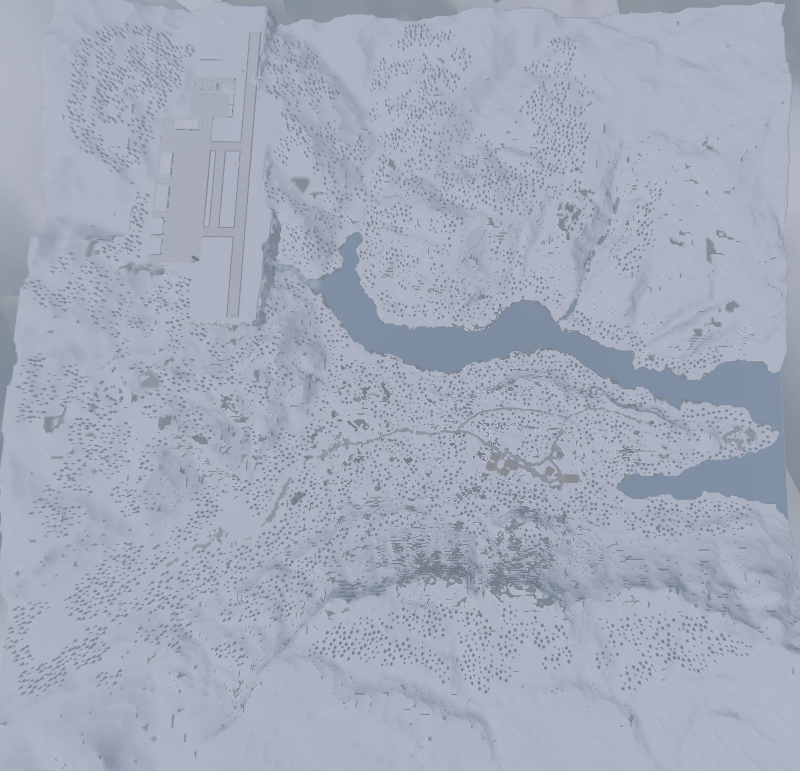 - Overhead bird's eye map showing full layout — airport, town, lakes, outpost, wilderness