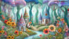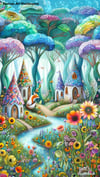 Whimsical fairy houses in a misty green forest with tall white twisty trees. There are poppies & sunflowers & a whimsical fox beside a sparkling lake. There are beautiful birds.