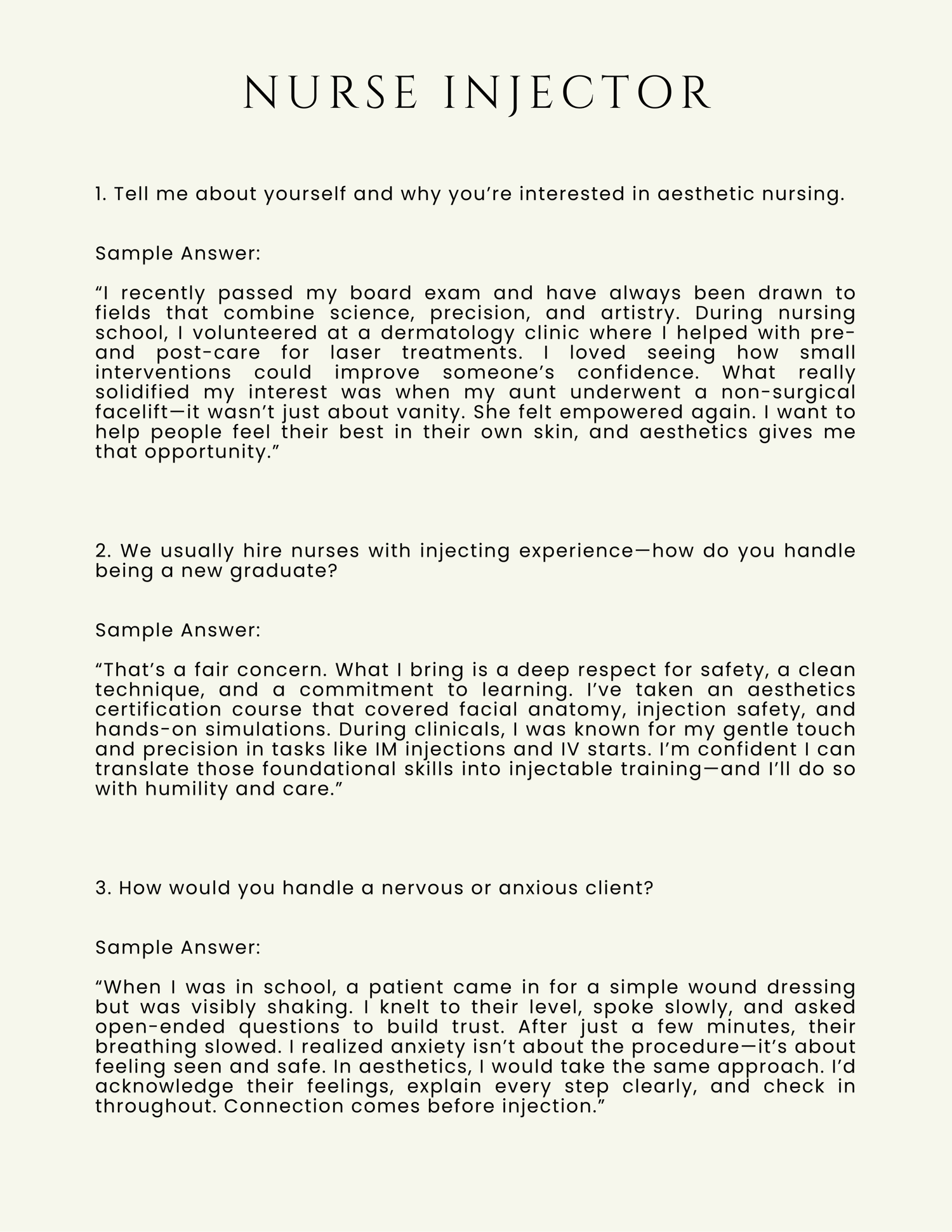 You’ll find interview-specific talking points, examples, and tips written in a supportive, conversational tone — just like a real nursing tutor guiding you through.