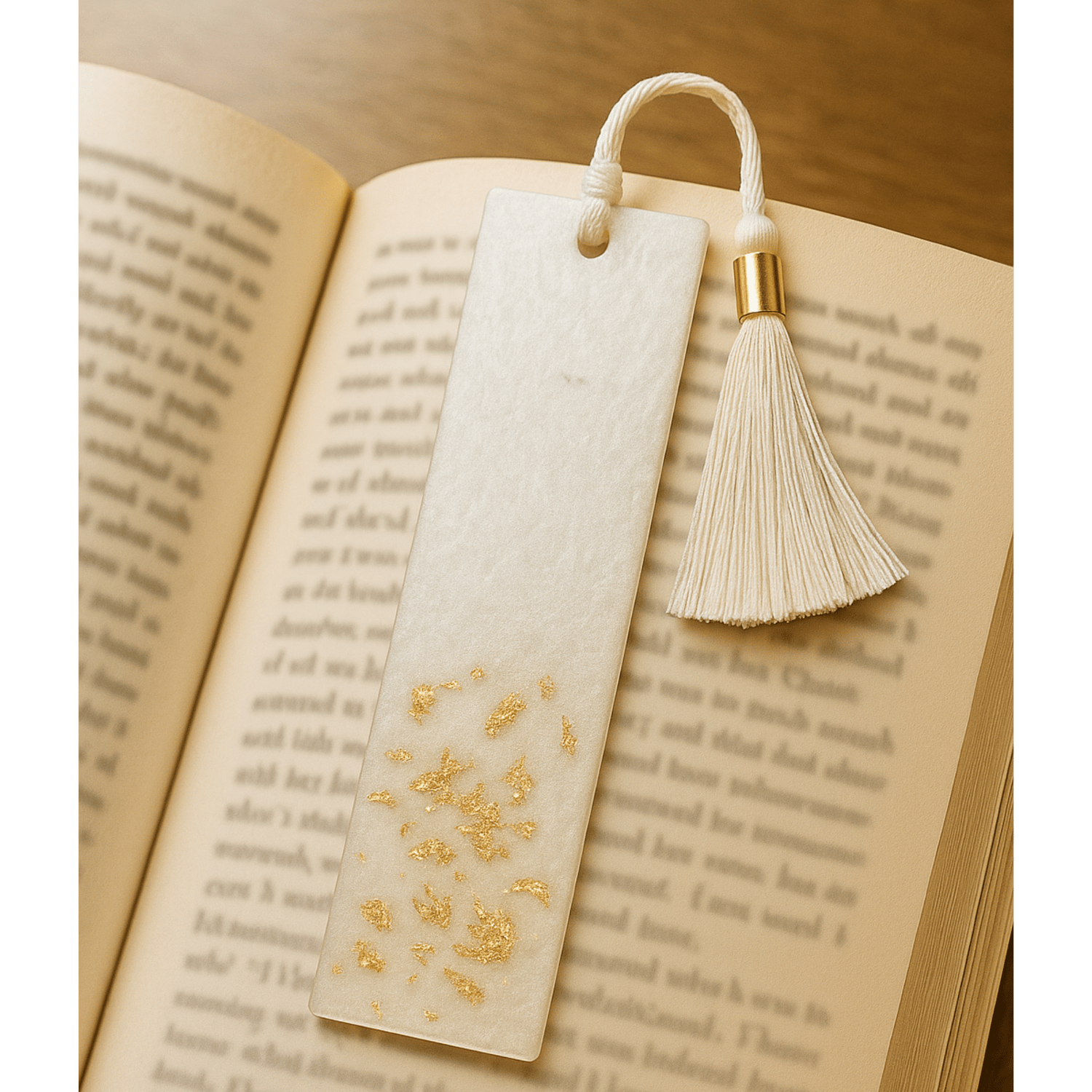 This handmade bookmark is part of our Winter Collection and brings a touch of calm to every chapter. Crafted in a soft frost-white resin and finished with scattered gold detailing, it’s designed to feel peaceful, gentle, and beautifully understated—like a snow-quiet morning.