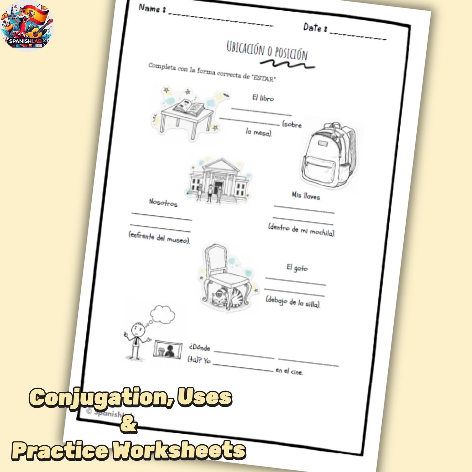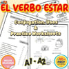 Este worksheet ayuda a estudiantes de nivel A1–A2 a dominar el verbo ESTAR, incluyendo su conjugación y sus usos principales: emociones, estados temporales, condiciones físicas y ubicación. También forma parte de nuestro completo Bundle de Gramática Española para práctica total.