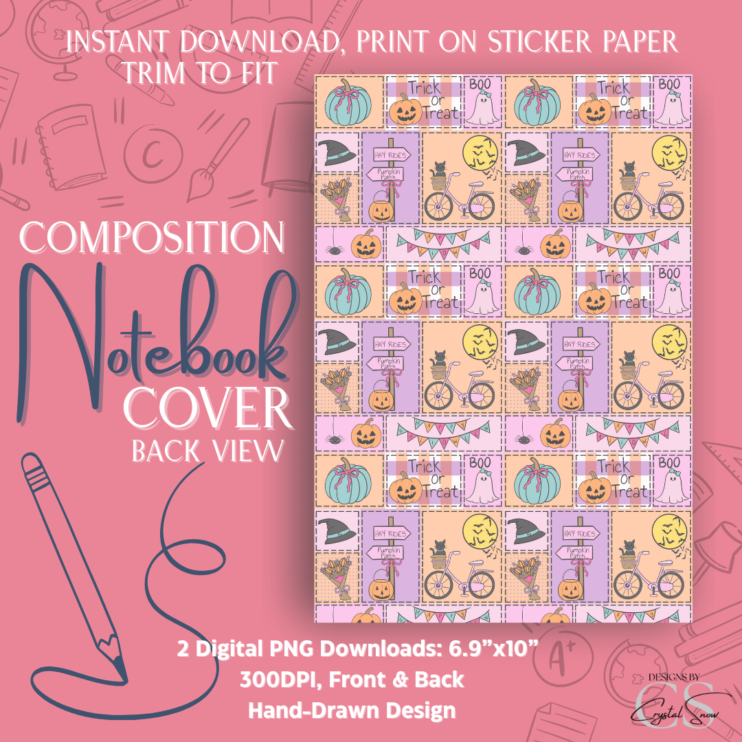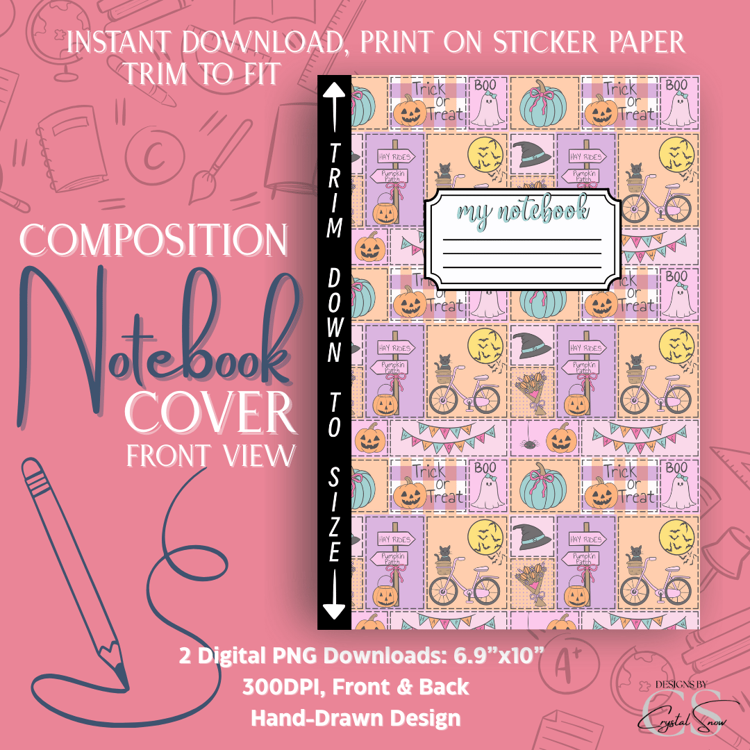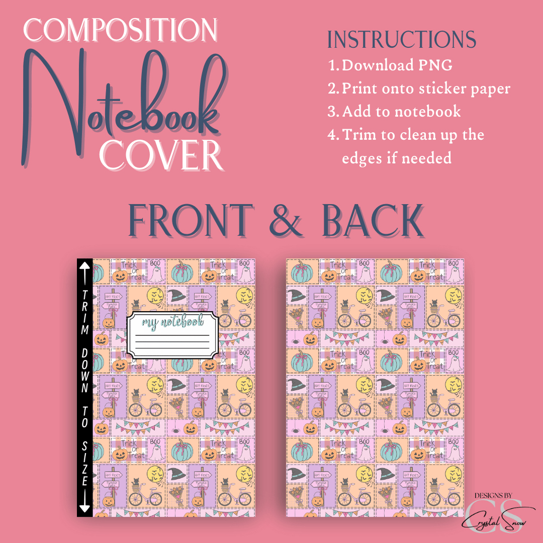 Sized for a standard 7.5” x 9.75” composition notebook, this printable design makes customizing your school or work supplies super easy. Just print, trim, and apply for instant Halloween vibes. A fun project for teachers, crafters, or anyone who loves seasonal DIY!