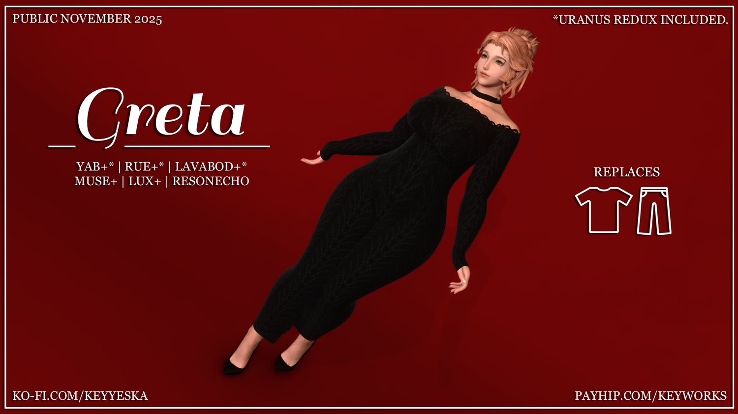 Custom mesh and textures. Created with Blender, Substance Painter, and Photopea. Thumbnail shows outfit on UranusRE w/ Standard legs (LaRue+) with Customize+ on.
