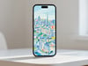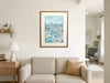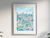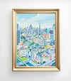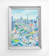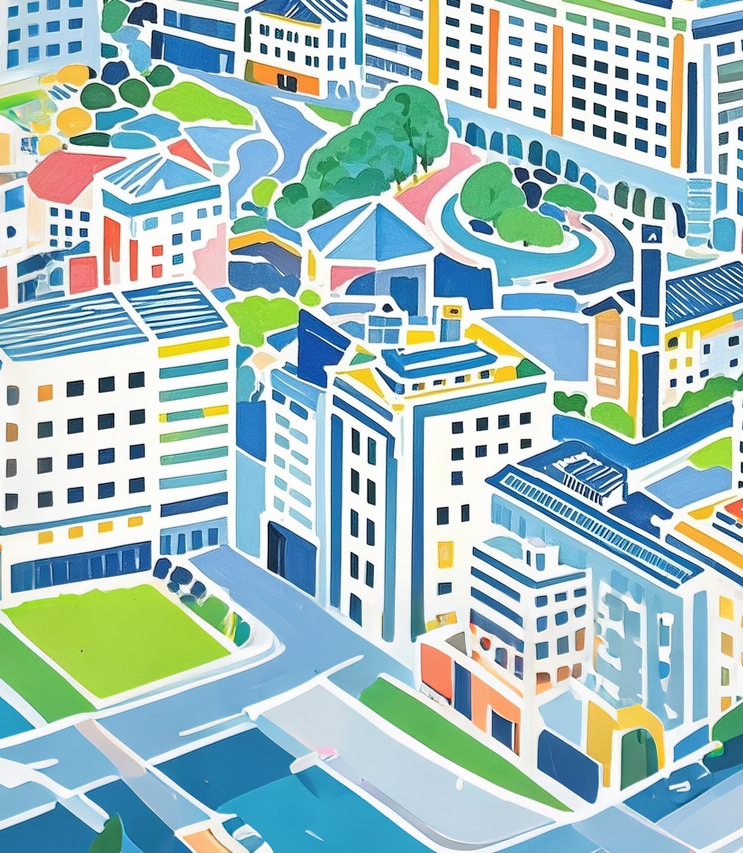 This artwork presents a vibrant and structured cityscape illustration that balances liveliness with order. The bright palette—dominated by blues, greens, and accents of orange—creates a refreshing and optimistic atmosphere, perfectly suited to an urban scene. The use of white outlines around the buildings adds a playful pop-art quality while enhancing depth and clarity.
