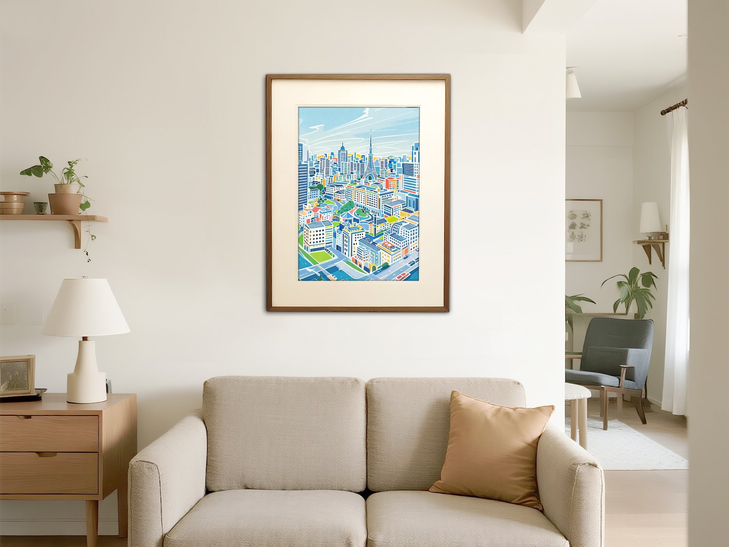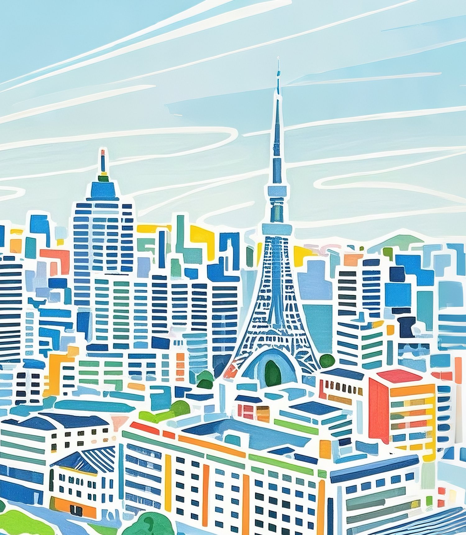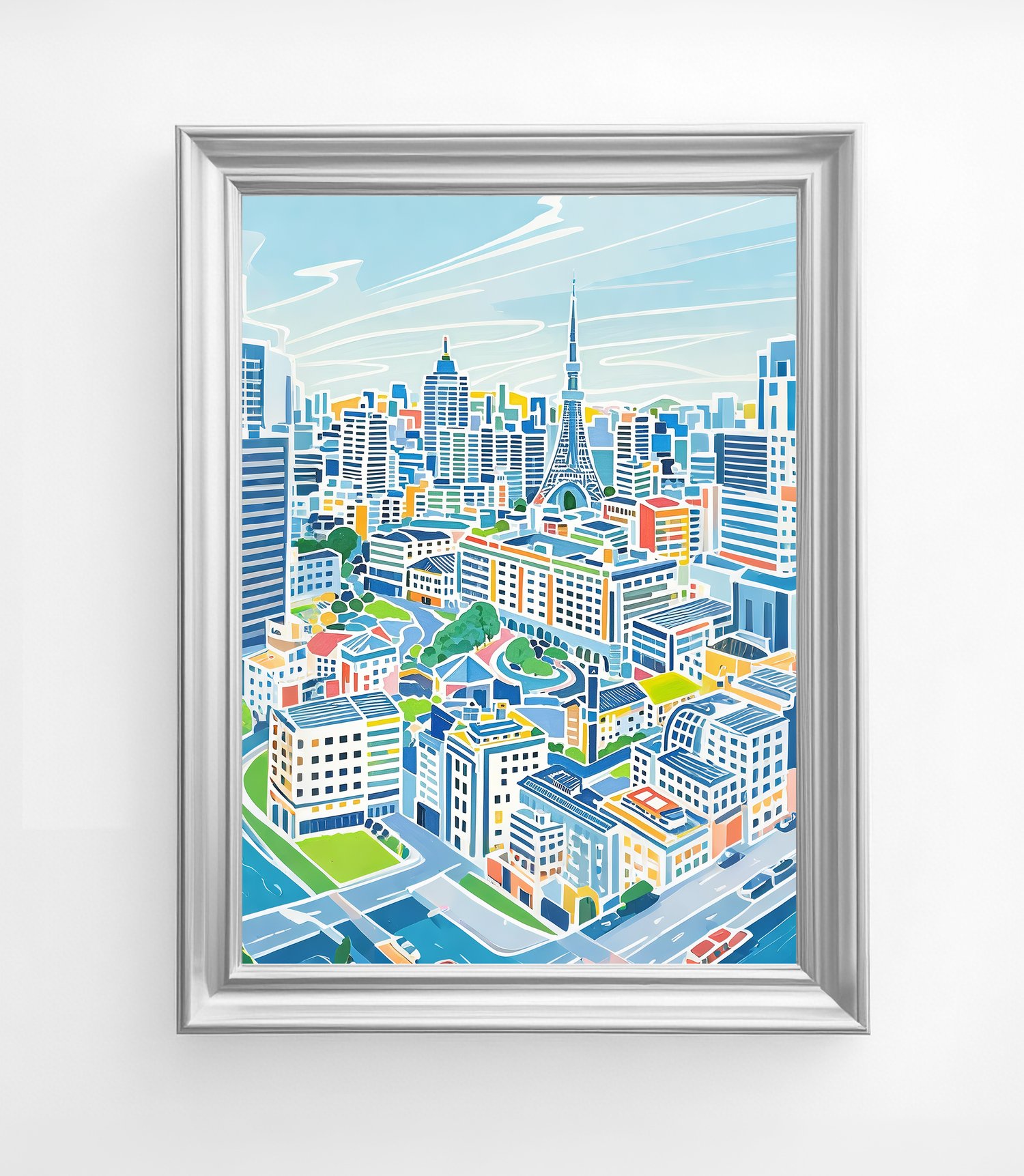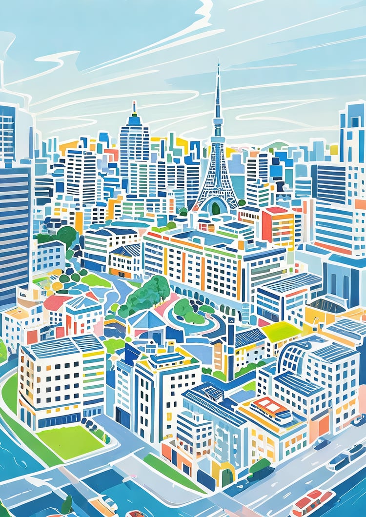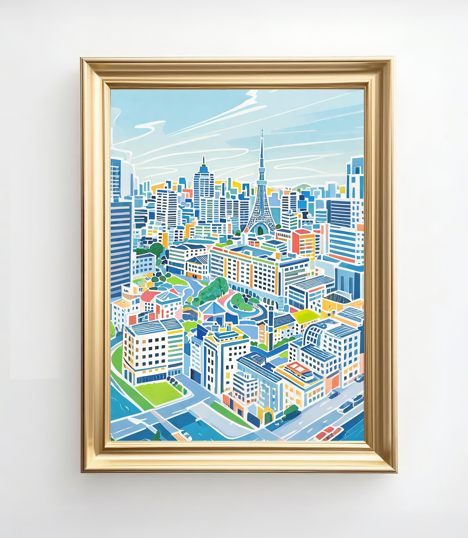 Placing the Tokyo Tower at the center gives the composition strong symbolism, making it immediately recognizable and emotionally engaging as a cultural landmark. The simplified yet detailed depiction of various buildings conveys the rhythm and diversity of the city, giving viewers a sense of movement and modern dynamism.