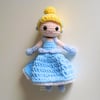The Princess Cinderella doll features a low-sew amigurumi wearing her beautiful and iconic blue ball gown from the Cinderella Disney Movie. At 11 inches in height, she’s plush and huggable for any little princess lover. She is almost completely no-sew and worked all in one piece, except for attaching the hair cap to the head.