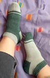 These socks are knit in Alley Cat Yarns Leo BFL [colors: Fir and Crystal], a sturdy, beautiful sock yarn.
