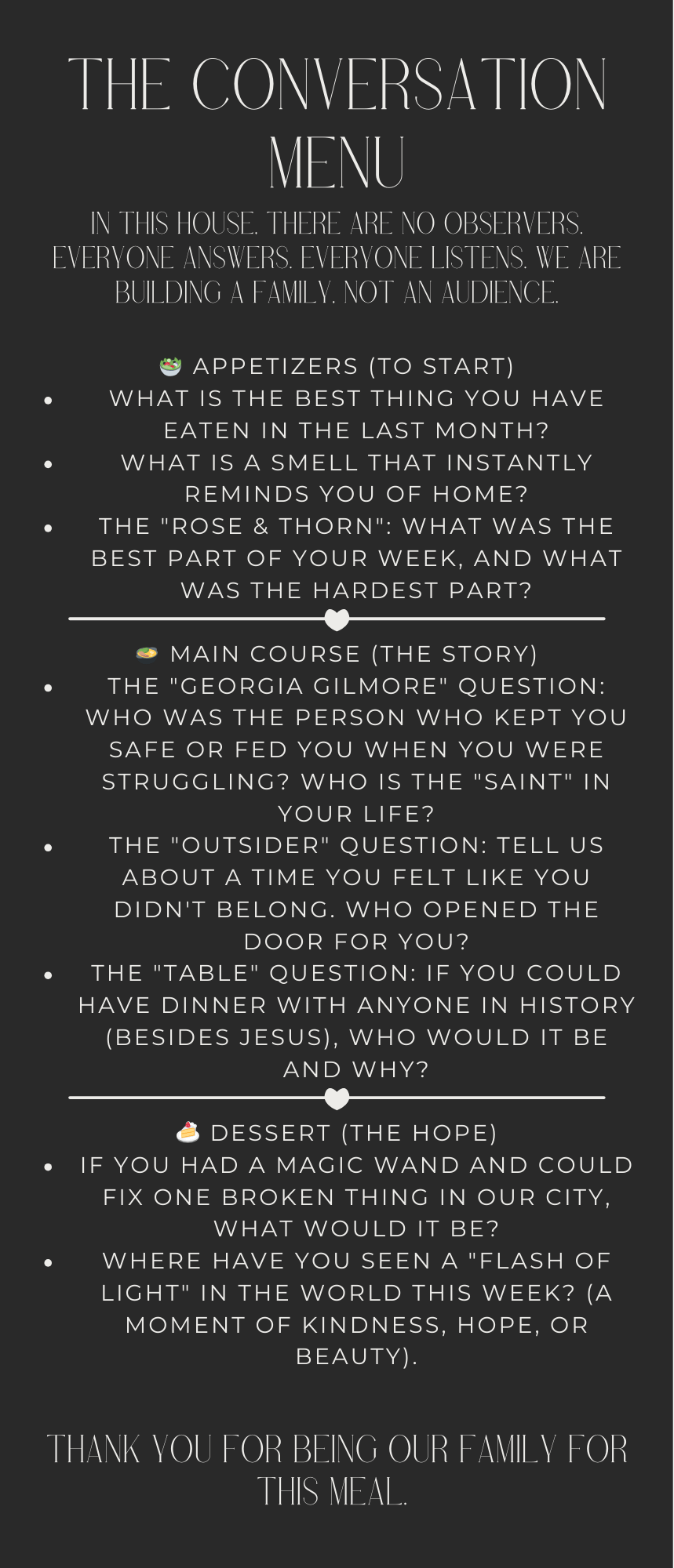- Side A: The Liturgy of the Open Door A powerful, short reading to share before the meal begins. It consecrates the space, relieves the pressure of perfection, and reminds every guest that they belong. It shifts the dynamic from "Entertaining" to "Sanctuary."
