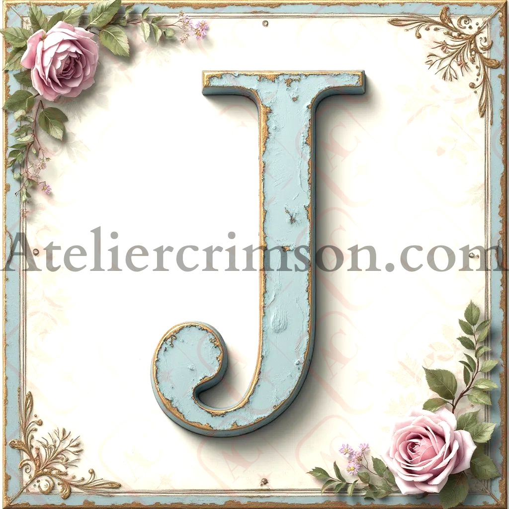 The letter J shabby chic blue a work of art in soft pastel blue. These elegant characters, reminiscent of weathered painted wood, stand out against a delicate off-white background with subtle floral accents. Perfect for vintage-inspired home decor, DIY projects, or creating unique, personalized gifts with a touch of timeless elegance.
