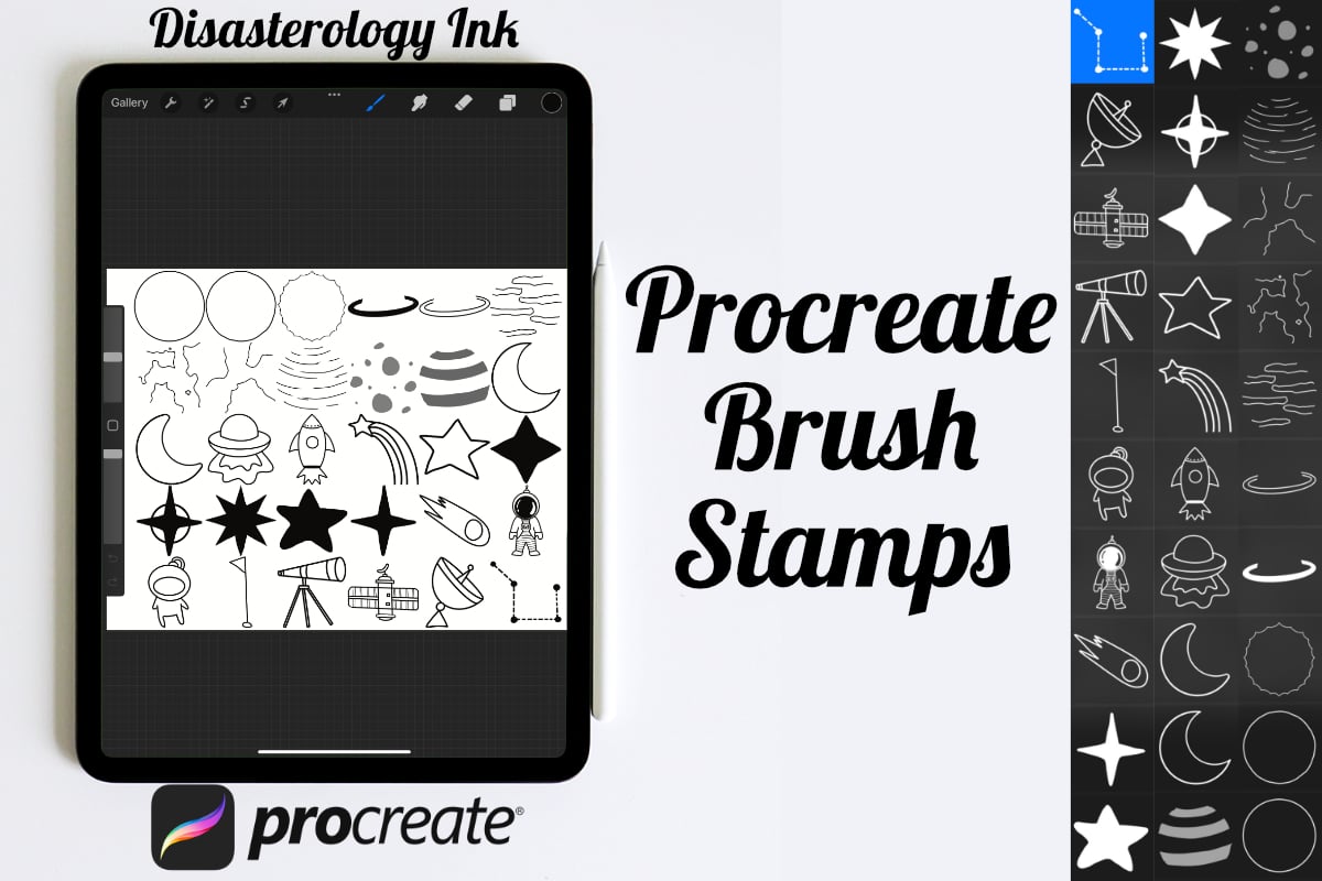 Procreate stamps save time when drawing, saving the effort of having to recreate the same thing for multiple designs and projects, save time on your design by purchasing these space icon brush stamps so you can utilise that time on creating more beautiful art.