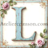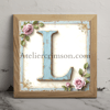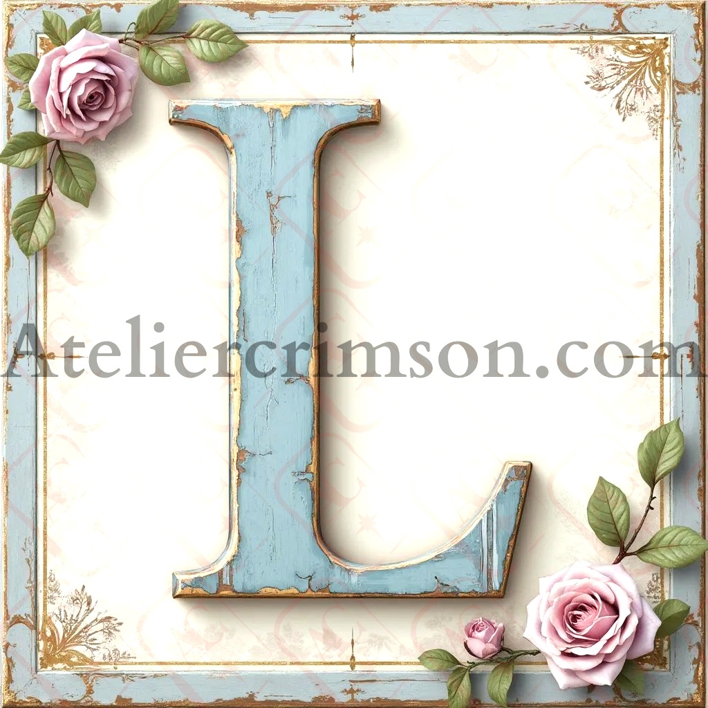 The letter L shabby chic blue a work of art in soft pastel blue. These elegant characters, reminiscent of weathered painted wood, stand out against a delicate off-white background with subtle floral accents. Perfect for vintage-inspired home decor, DIY projects, or creating unique, personalized gifts with a touch of timeless elegance.
