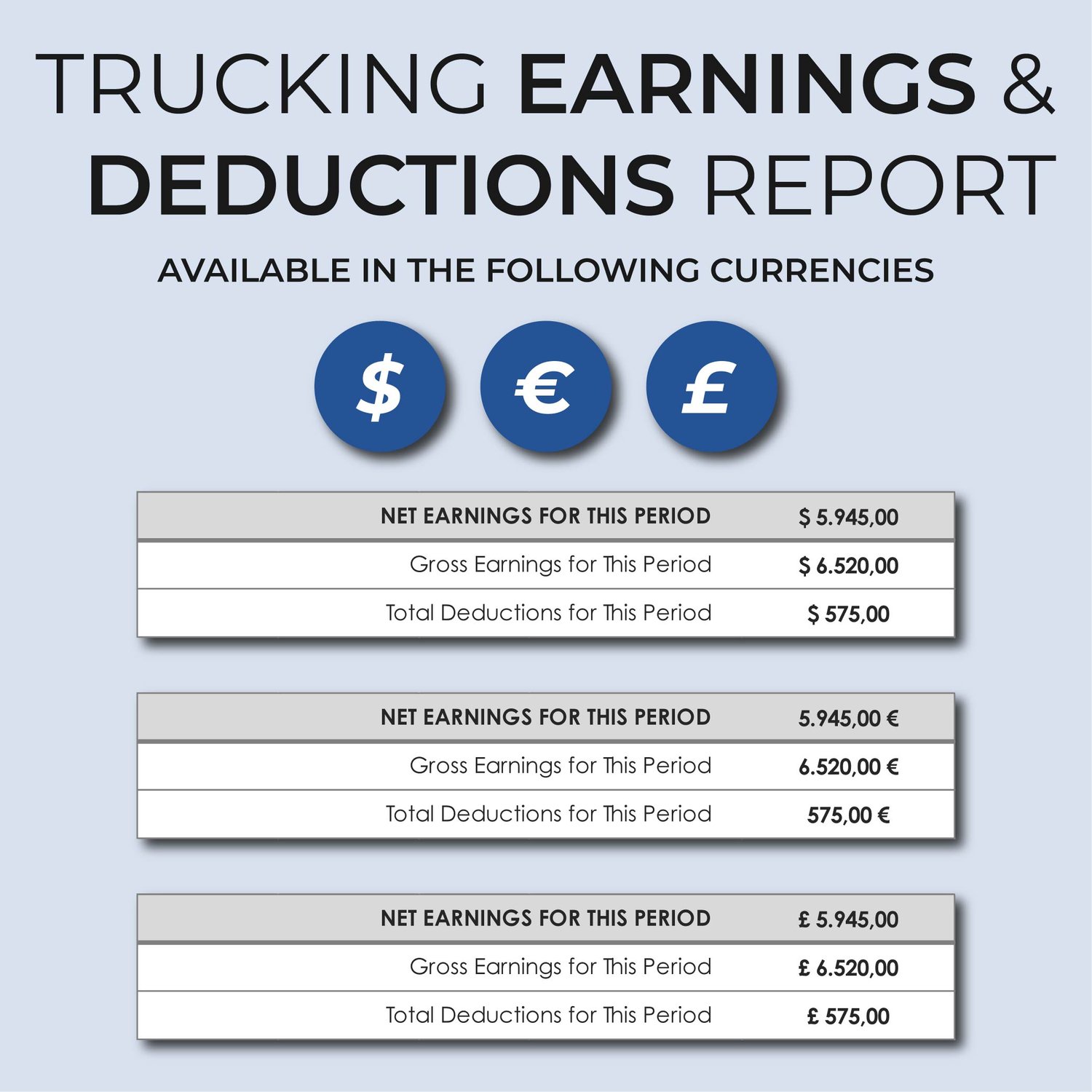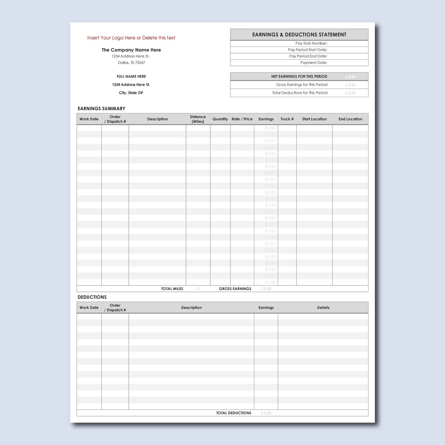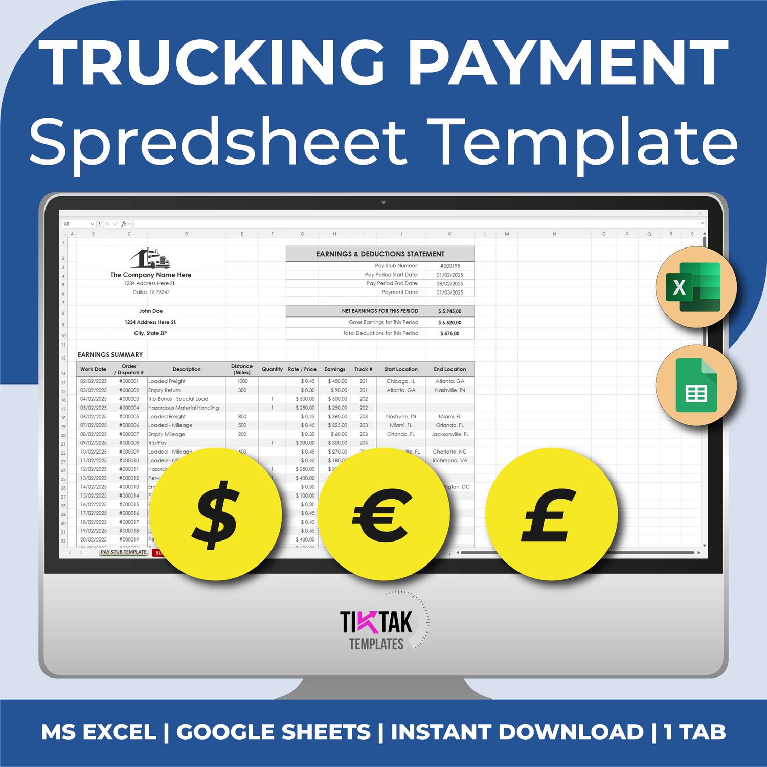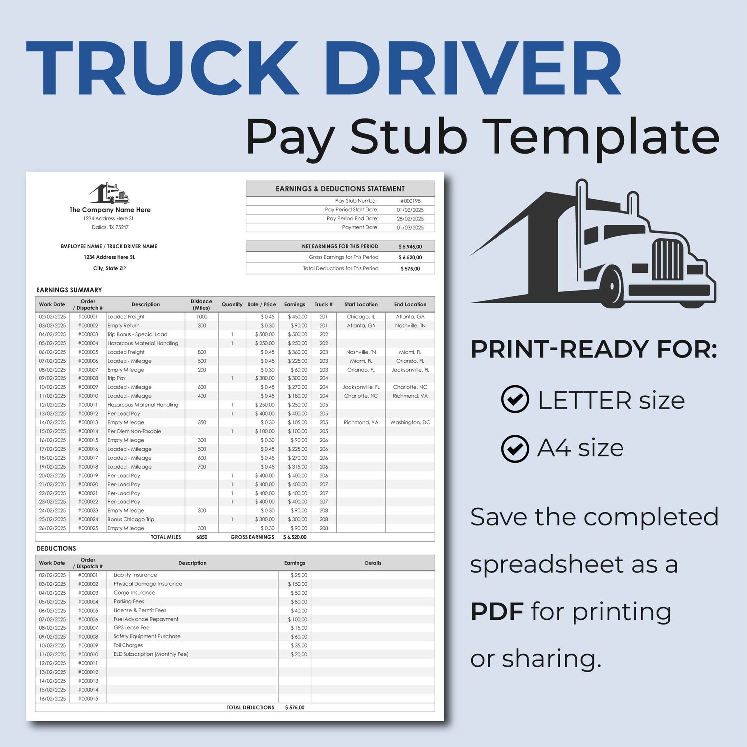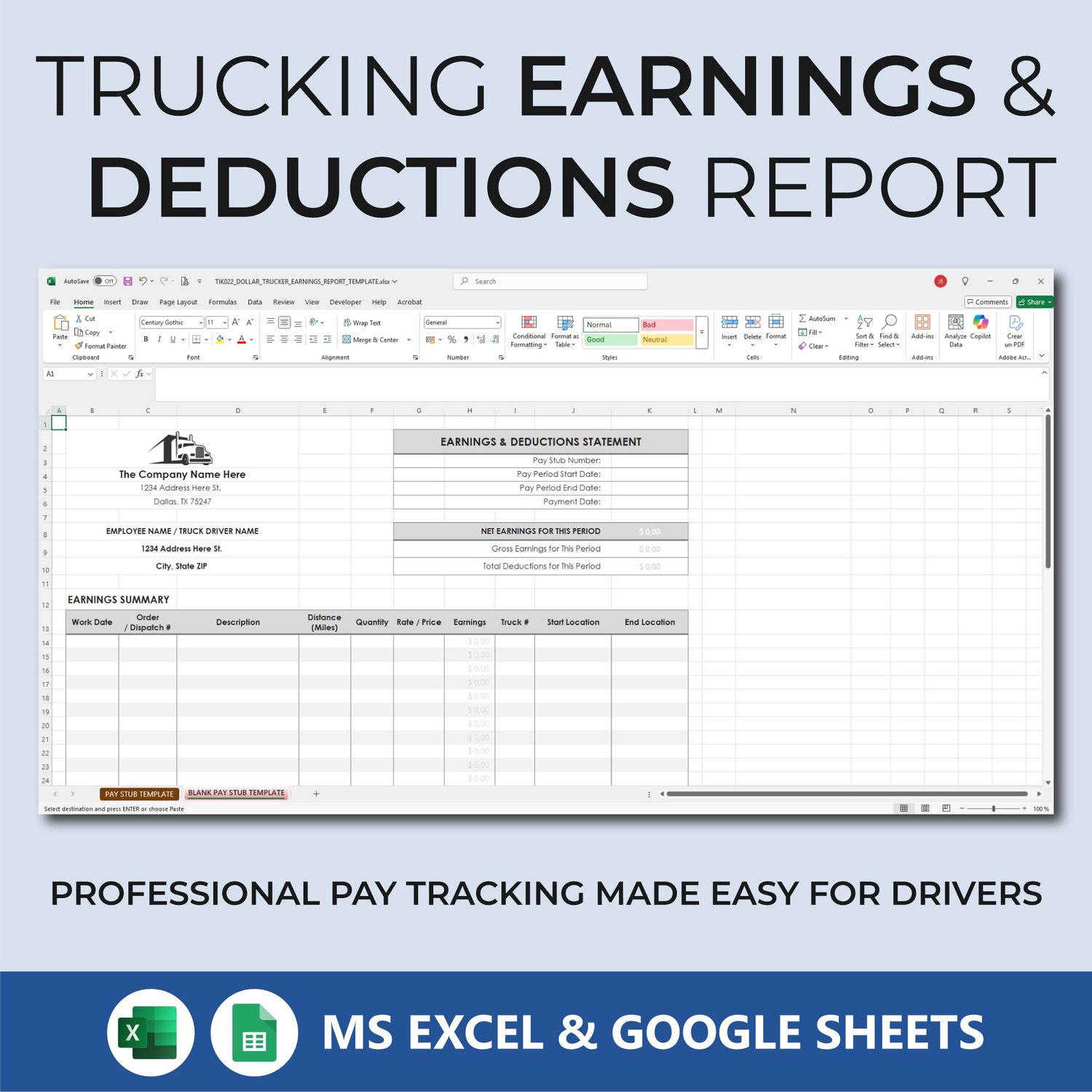 Trucking Pay Stub & Earnings Report – Driver Payment Tracker Template (Excel & Google Sheets)