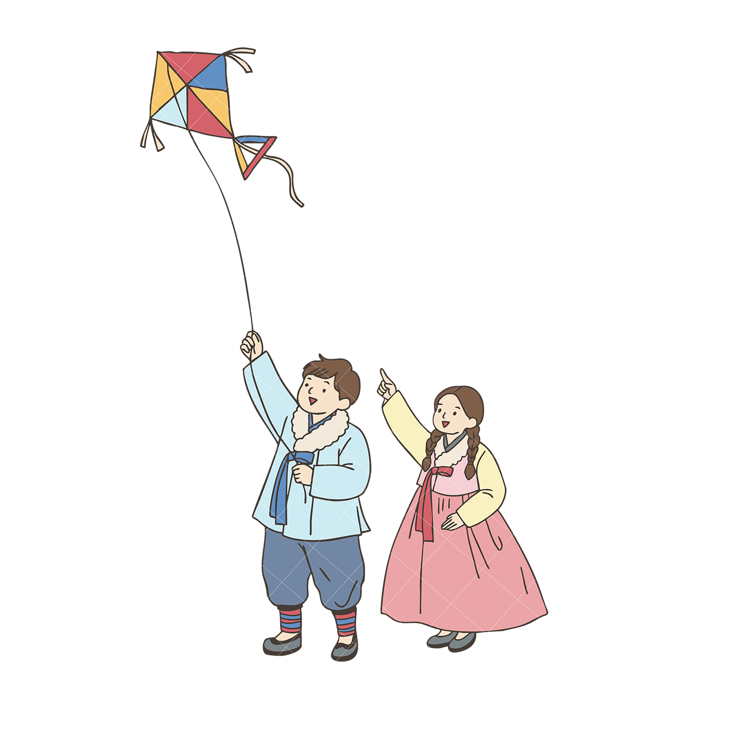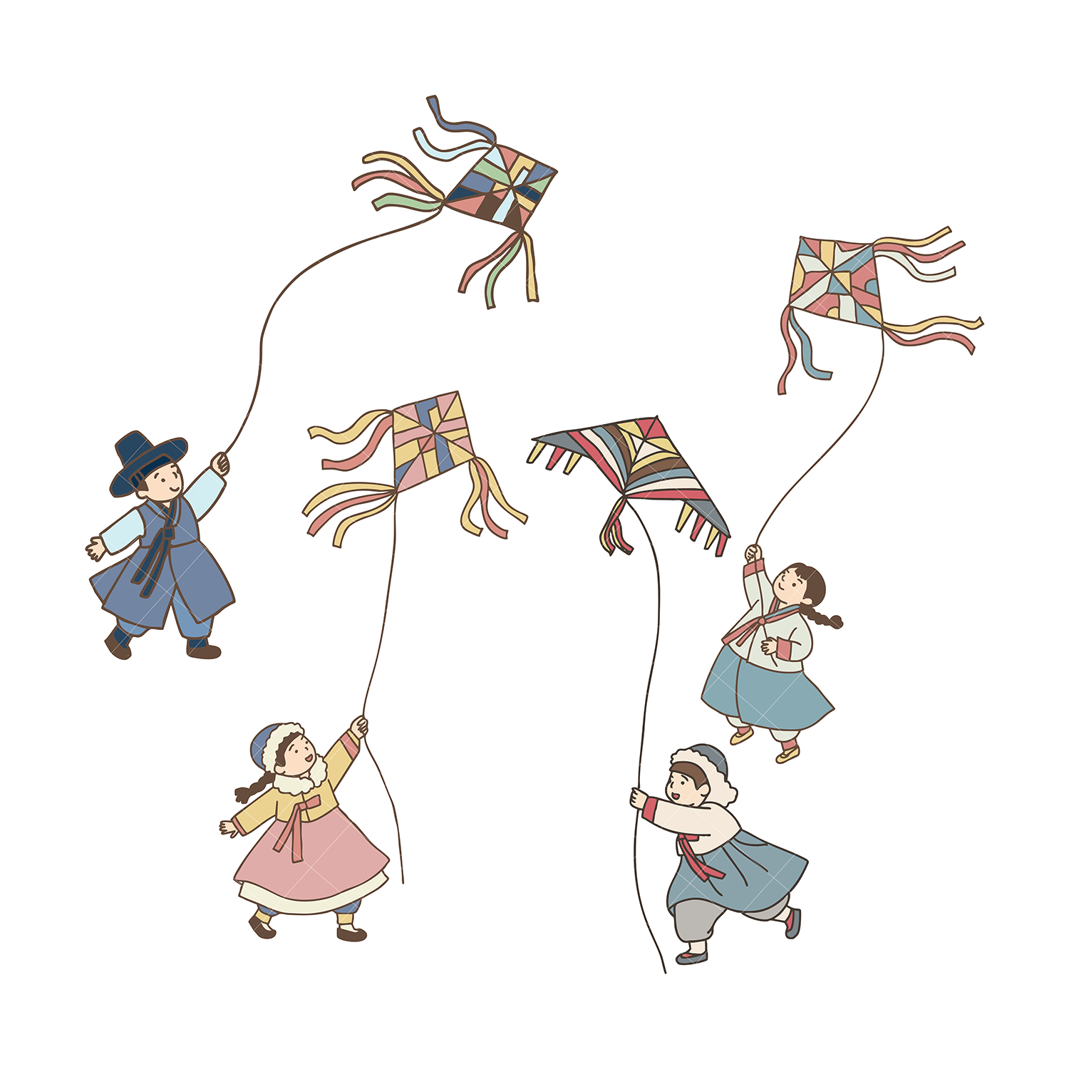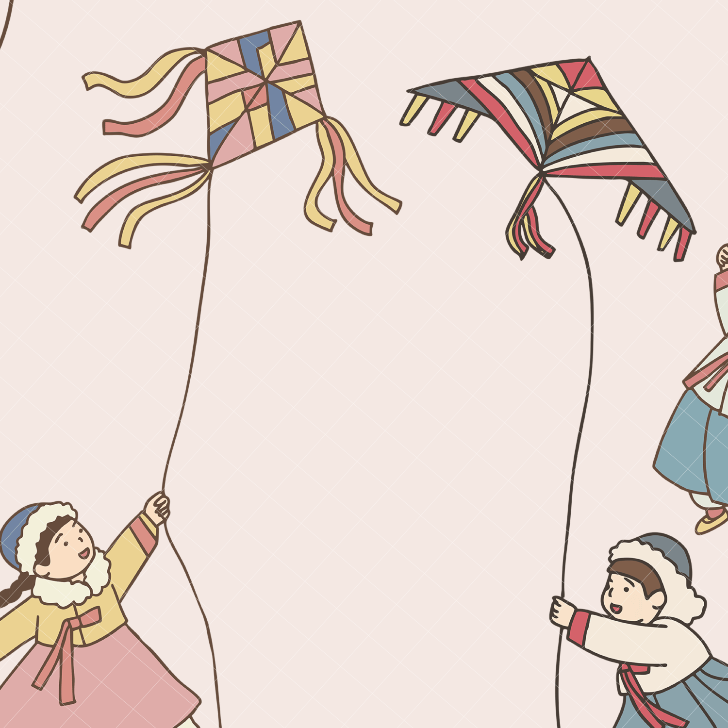 Ideal for Seollal-themed greeting cards, festive holiday decorations, Korean New Year stationery, cultural event flyers, stickers, prints, digital projects, scrapbooking, and creative planner tags featuring Hanbok characters flying kites. Perfect for designers, crafters, and anyone who loves Korean culture and traditions!