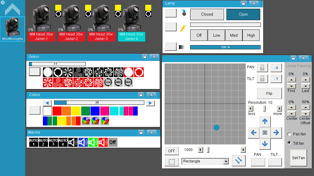- Selección de 7 Gobos (propios del equipo dibujados) + Open + rotación de la rueda de Gobos + Shake de Gobos.