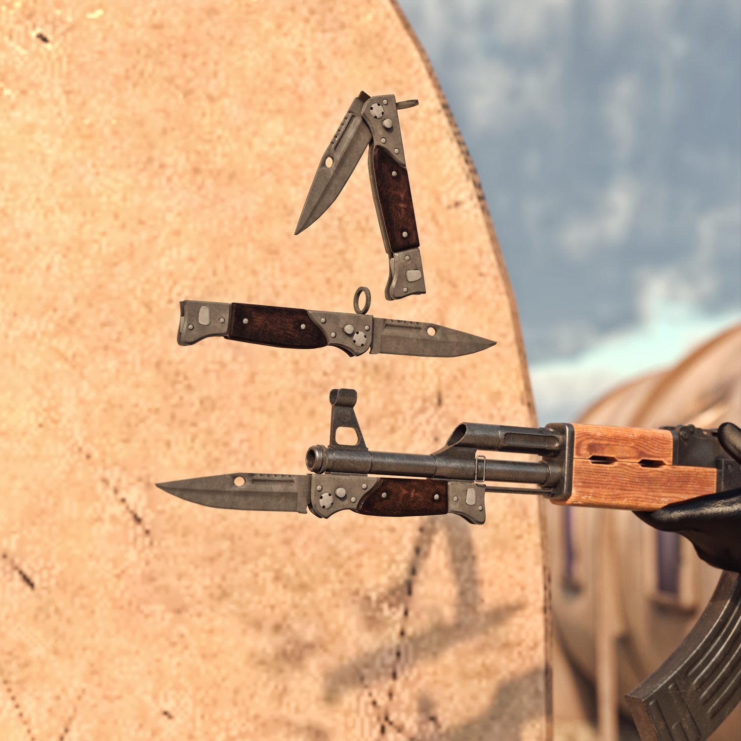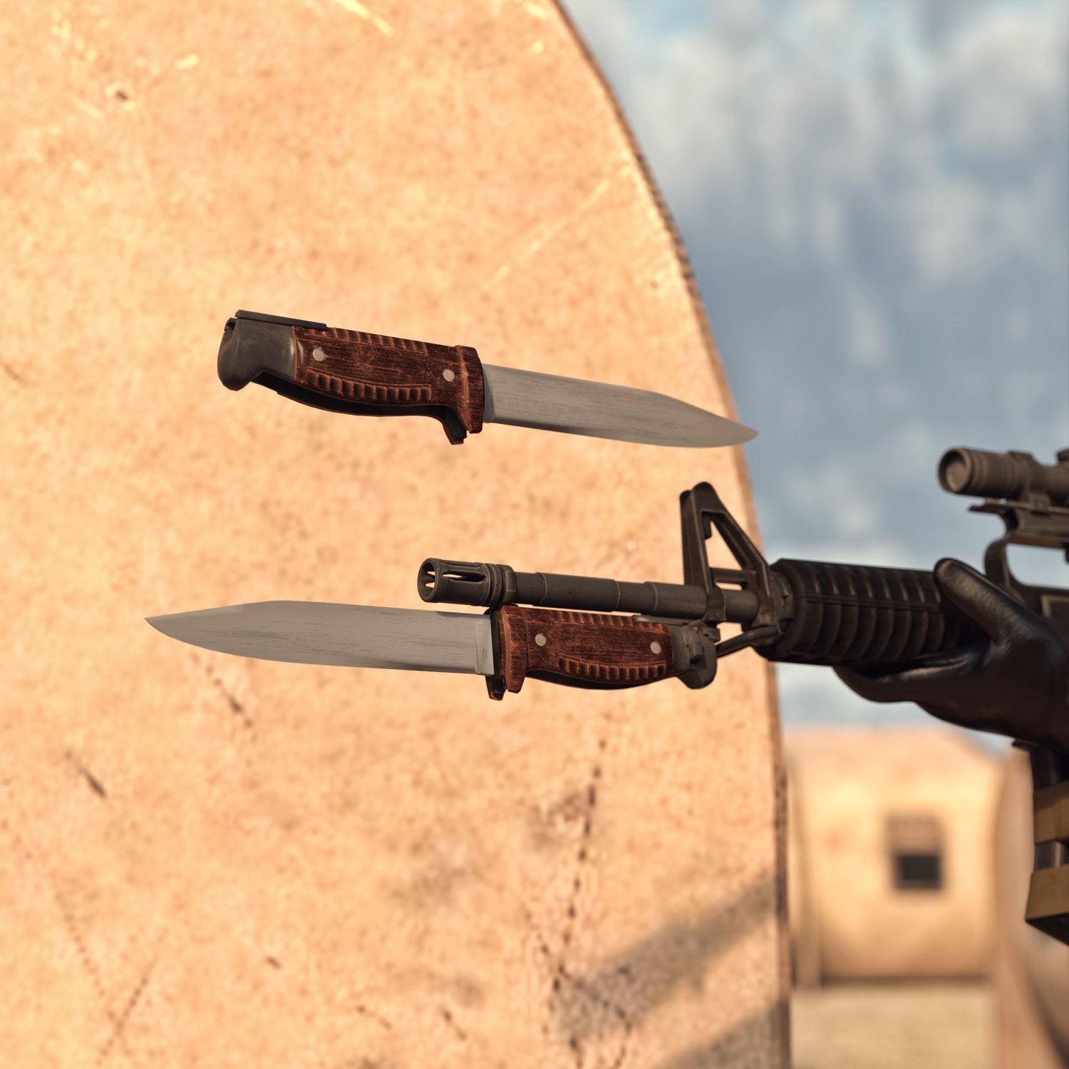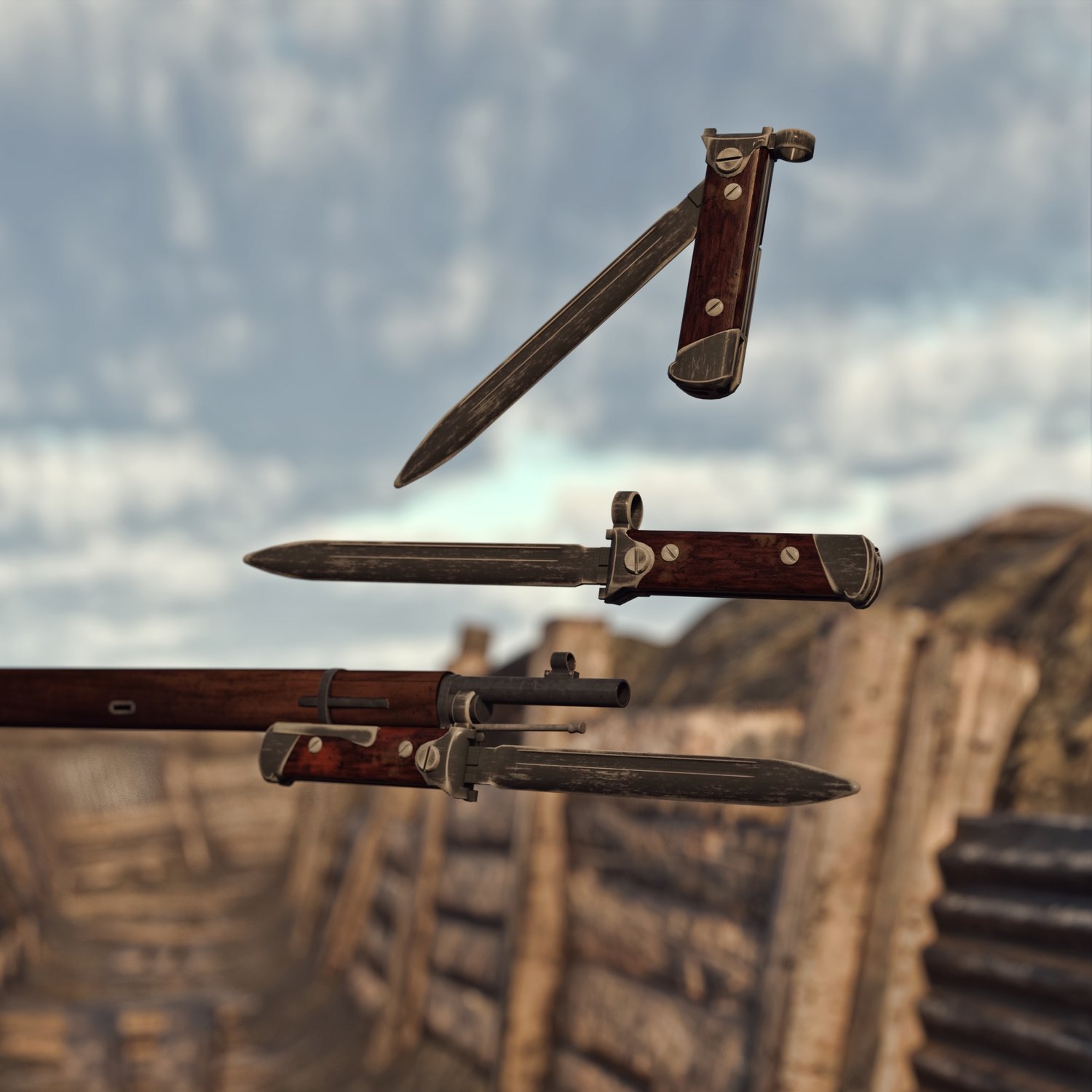 A bunch of bayonets to upgrade your guns, from about WW1 to modern ones. The bayonets can also be used separately as knives (doesn't include wearable presets, but shouldn't be an issue). Just parent it to your gun, scale appropriately and use. Some of the bayonets are also foldable, for extra coolness. Some also have scabbards for easy carry. The bundle also includes a trench stiletto, because why not :)