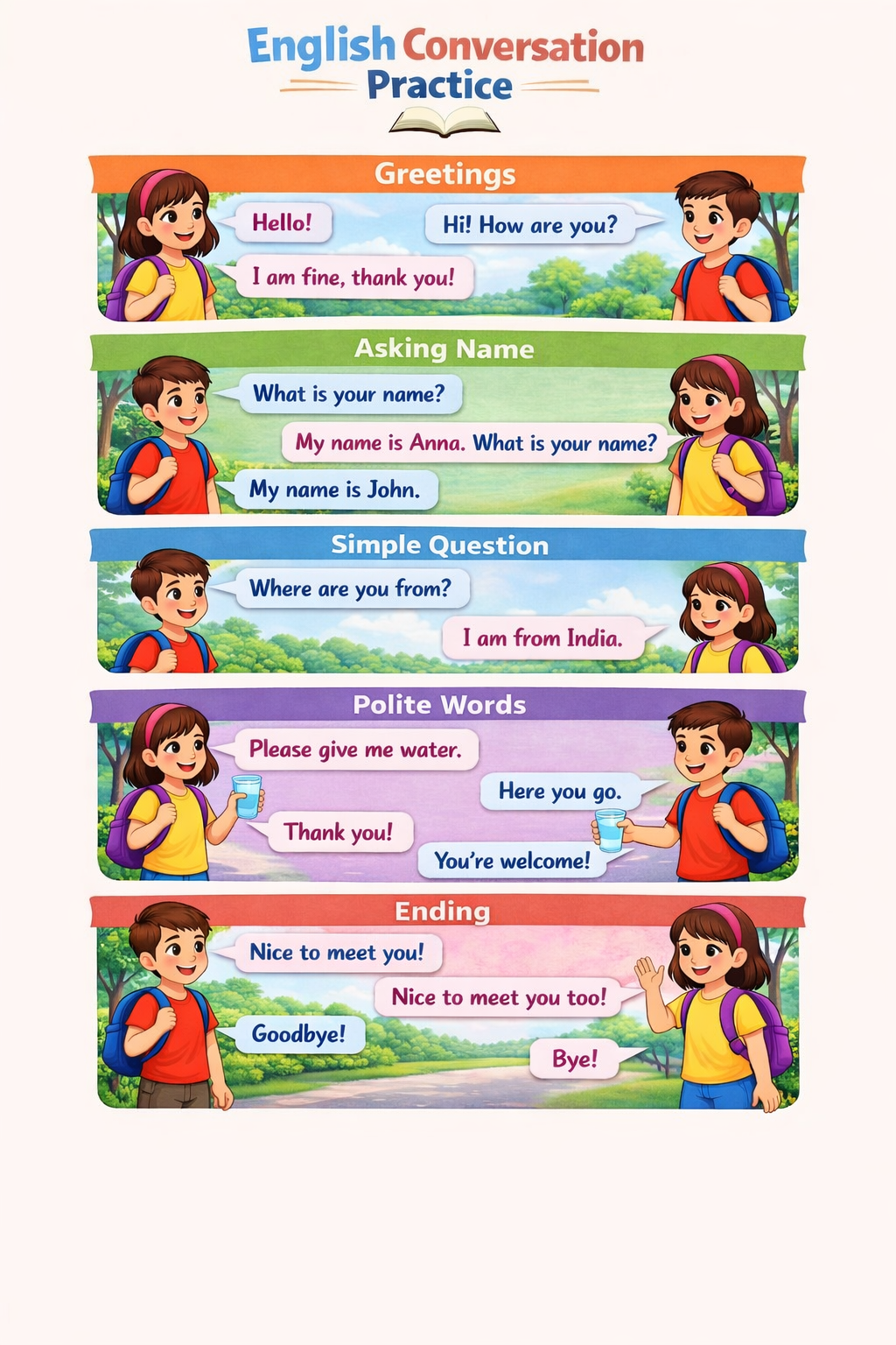A simple and engaging English conversation chart for kids to practice daily speaking skills including greetings, asking names, polite words, and basic questions.