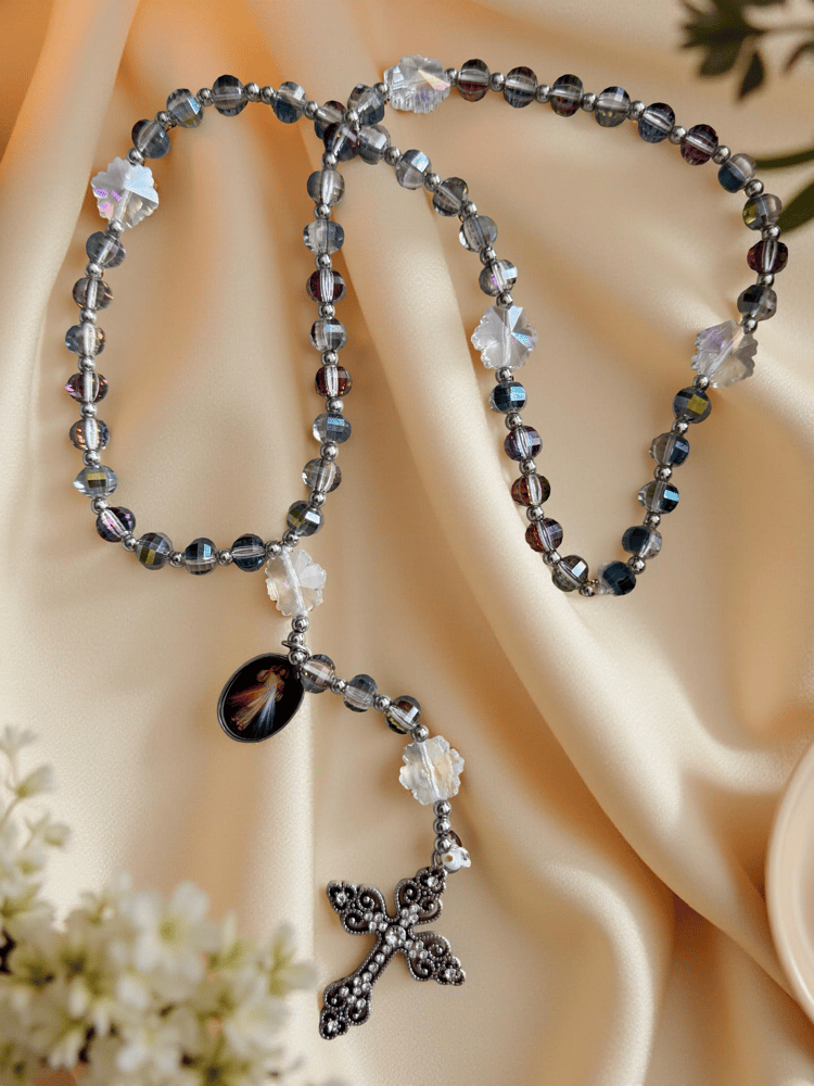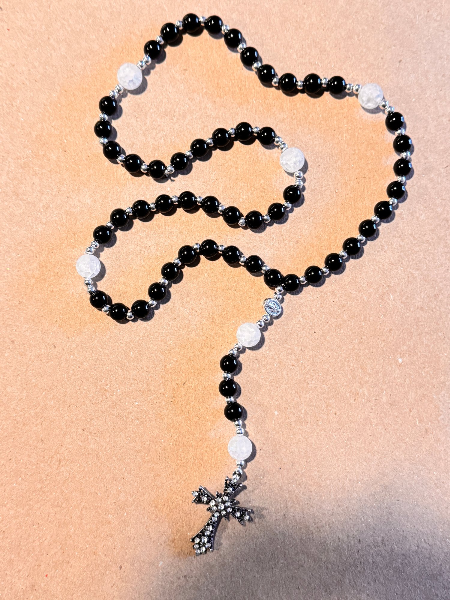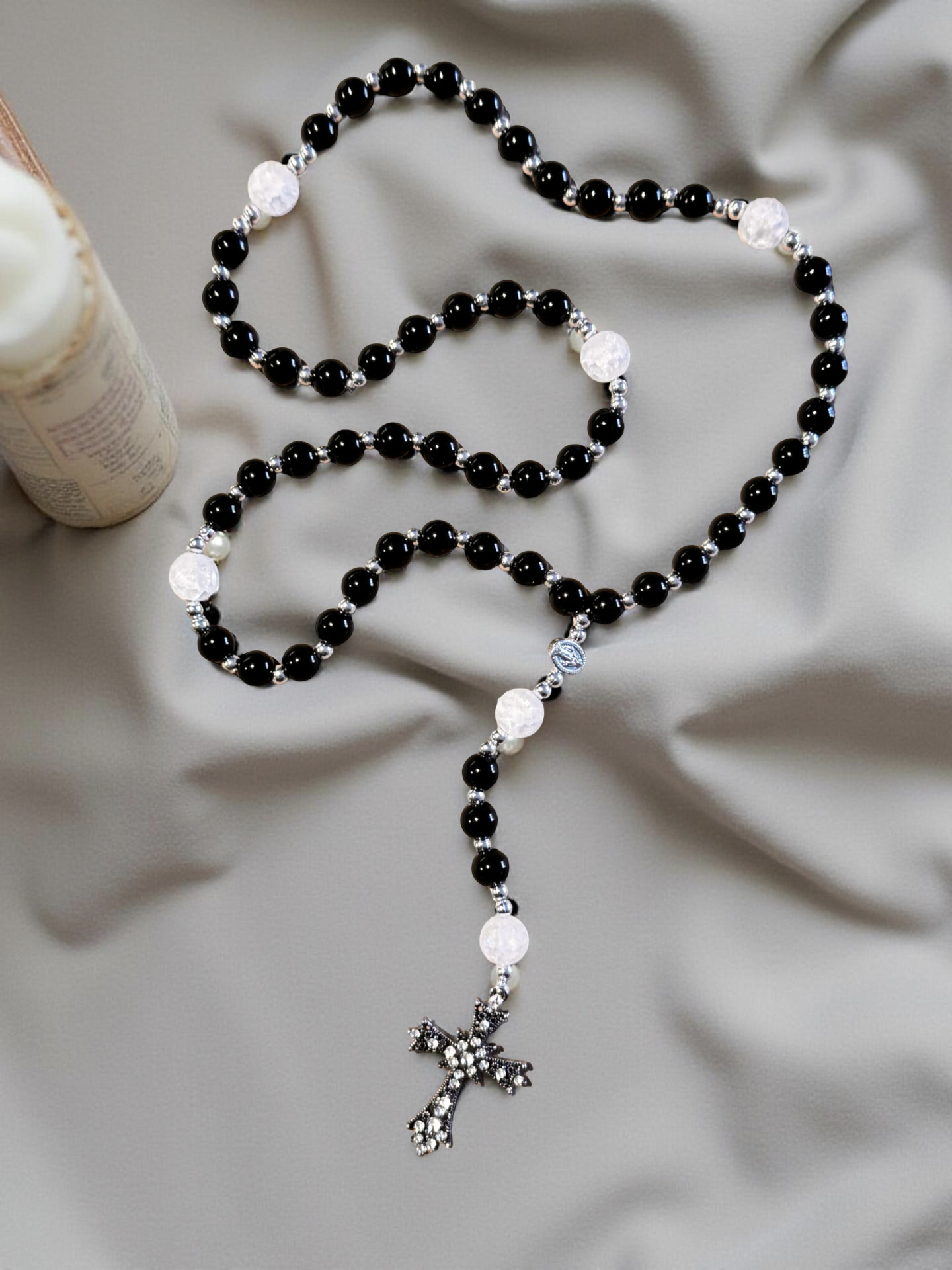 Each rosary is assembled bead by bead with intention and care. The combination of 8mm black coated glass Hail Mary beads, larger 10mm white coated glass crystal Our Father beads, silver-tone separators, a Miraculous Medal centerpiece, and a classic silver-tone cross creates a refined devotional companion built for strength and durability.