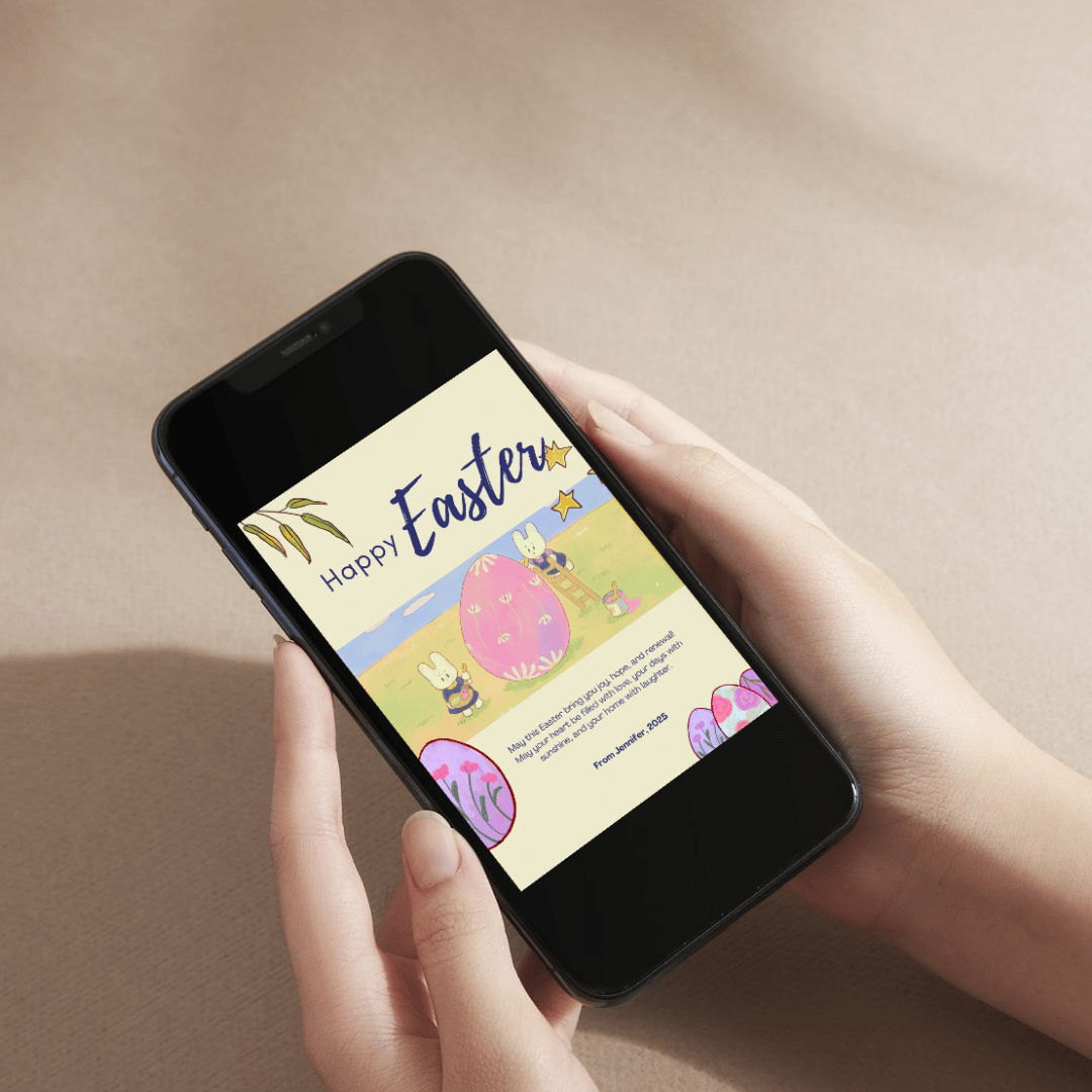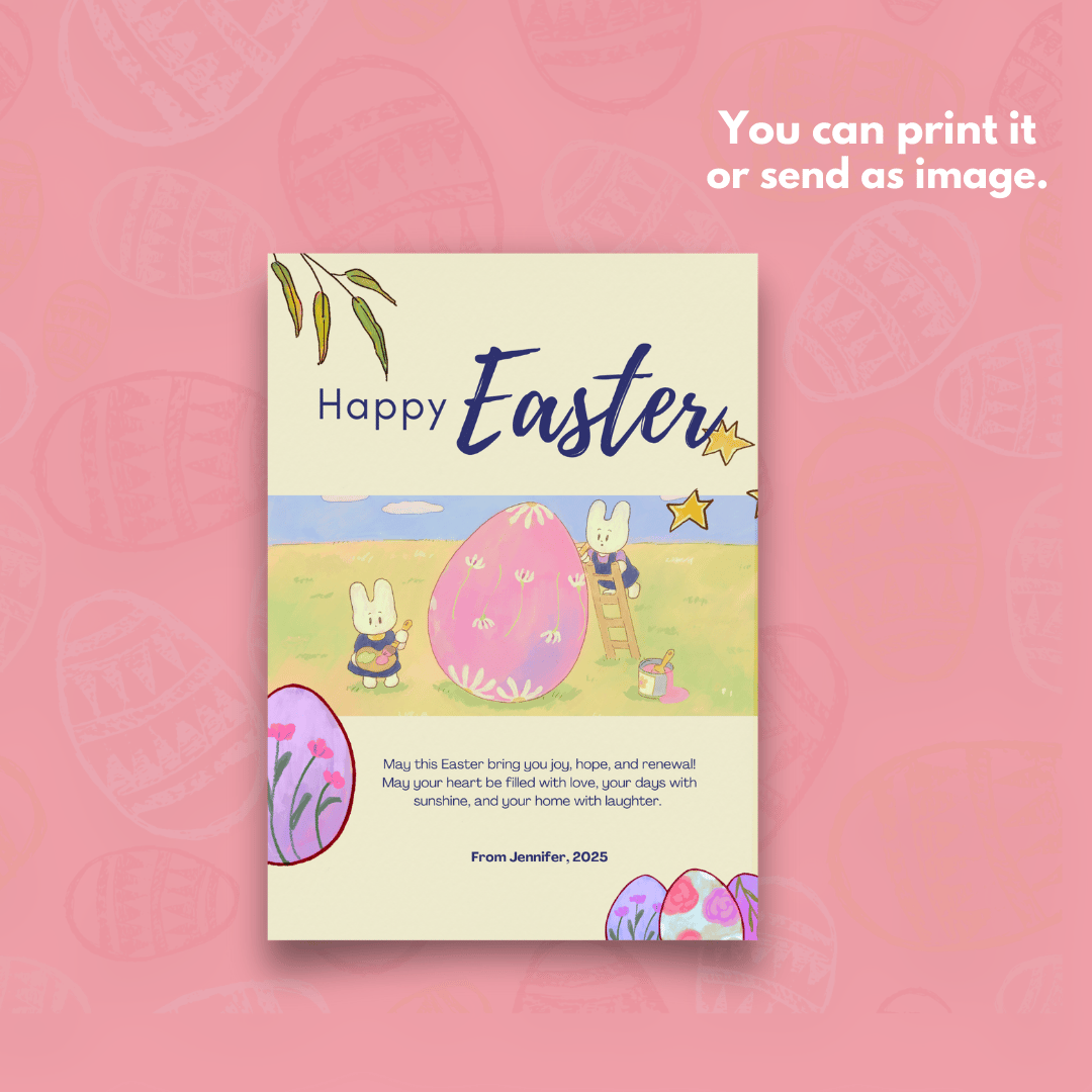 Featuring cartoon-style Easter elements, beautifully decorated eggs, and a vibrant spring color palette, this design is perfect for sharing the spirit of rebirth, joy, and togetherness with family and friends.