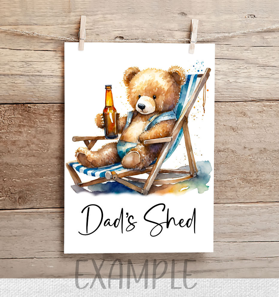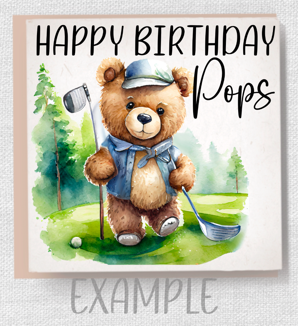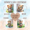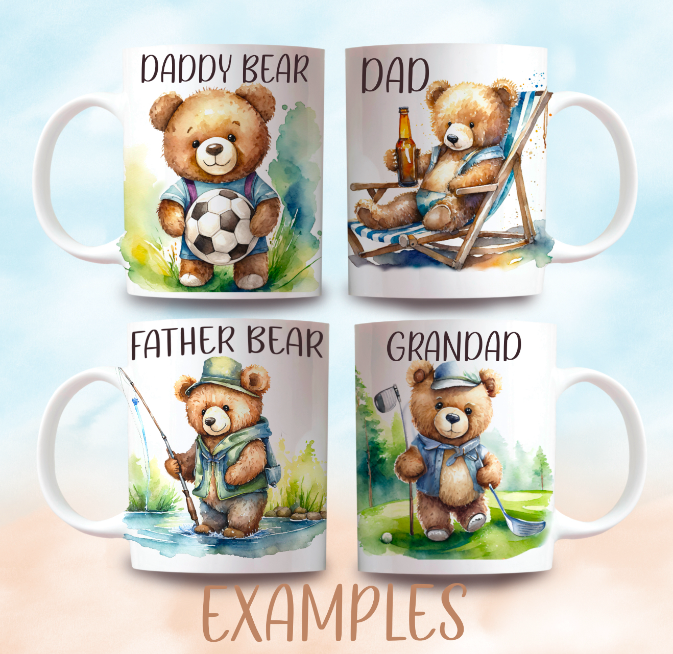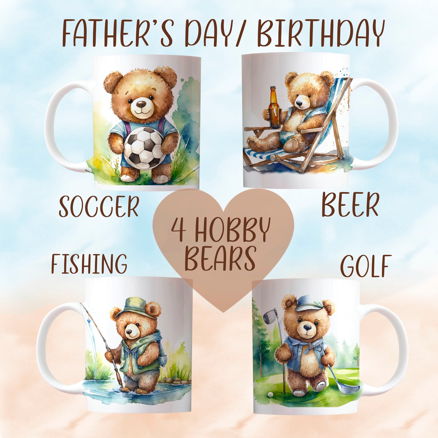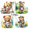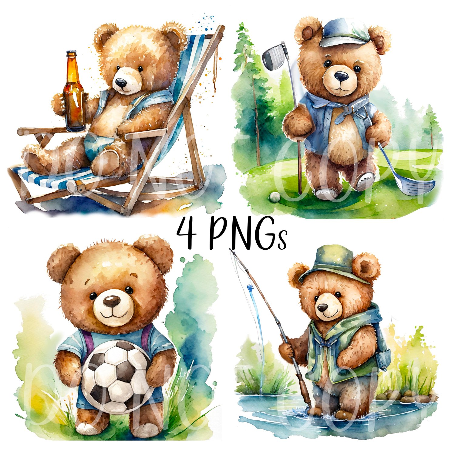 4 beautiful watercolour teddy bears; fishing, golf, beer, soccer/football. Ideal Father’s Day, Birthday, Grandad. 4 PNGs. Sublimation, print