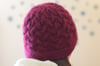 A simple, elegant hat for a rare and beautiful yarn. DOLCETTO begins with a rolled hem to frame the face then forms a double hem to keep the ears extra warm. The main body of the hat is worked in an allover cable motif and shaped within pattern.