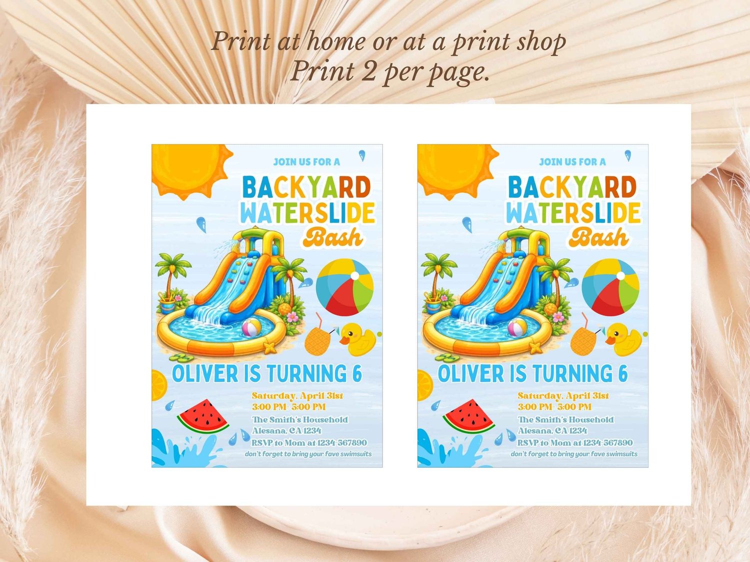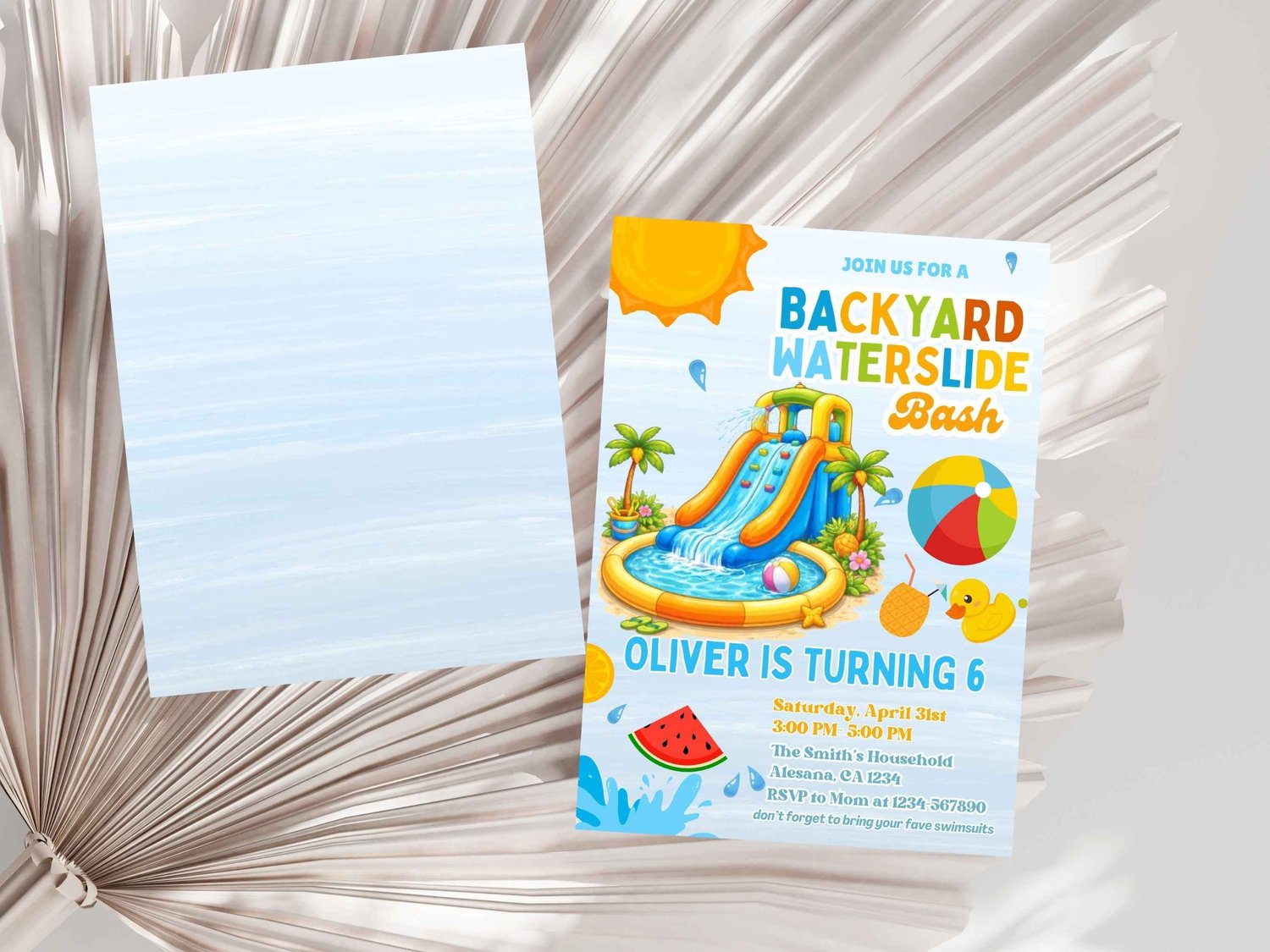 Waterslide Bash Birthday Invitation Template | Inflatable Pool Party Invite for Boys Turning 6 | 5x7 Canva Digital Download, Edit Yourself and Print | Backyard Water Slide, Beach Ball, Rubber Duck Theme | Modern Fun Kids Birthday Stationery