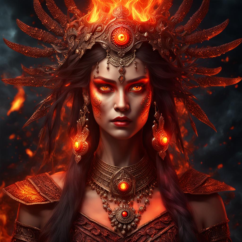 Product Description: Unleash the fiery power of the "Majestic Fire Sorceress Queen," a photorealistic digital portrait capturing the intense gaze and commanding presence of a sorceress queen in the Inferno Temple. With glowing red eyes and regal attire, she exudes majesty and raw power.