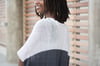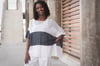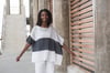 ACACIA’s dramatic silhouette and bold asymmetrical shape and striping is softened by ethereal fabric.