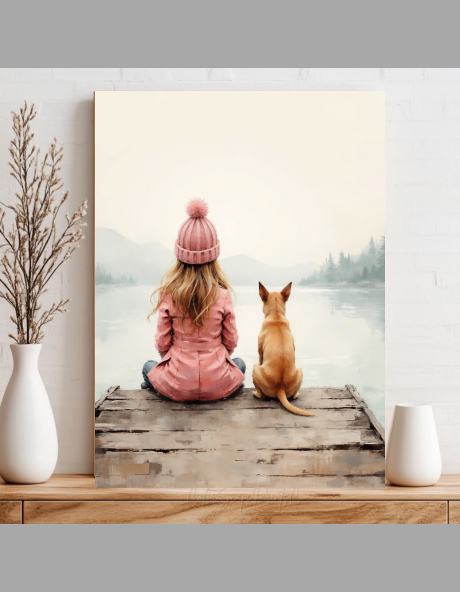 Bring warmth and serenity into your home with this beautiful wall art print of a girl and her dog sitting on a wooden dock overlooking a misty lake. The peaceful winter scene, featuring soft pastel tones and cozy details like the pink knit hat and coat, makes this artwork perfect for cabin decor, rustic farmhouse style, nursery wall art, or dog lover gifts.