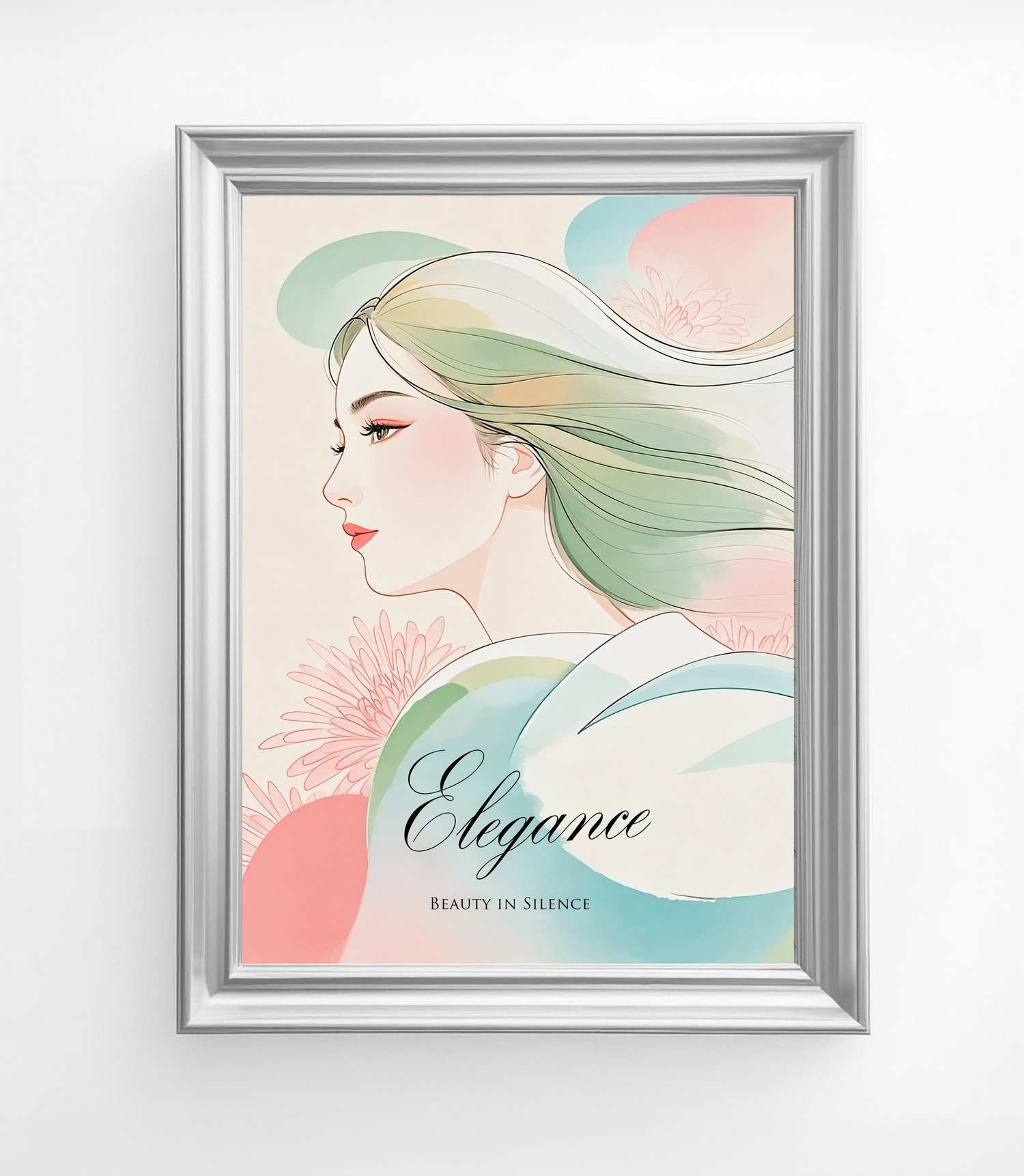 This elegant digital art depicts the profile of a woman with soft pastel colors, floral motifs, and windswept hair. As the title "Elegance" suggests, it expresses beauty and strength in tranquility. It's perfect for your bedroom, study or meditation space. It is an extremely elegant work, with delicate line drawings and gradations of light colors in perfect harmony. The profile of the woman expresses strength and elegance in silence, which makes an impression worthy of the title "Elegance." The pastel tones of the flowers in the background and the flowing movement of the hair make you feel the vibrancy of life while being quiet.