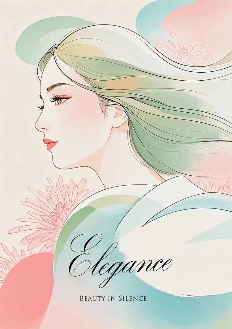 In addition, the kimono-like clothing design exudes oriental beauty, and the overall design is a sophisticated visual fusion of Japanese and modern styles. The subtitle "BEAUTY IN SILENCE" also complements the serenity and elegance of the work, both visually and by message.