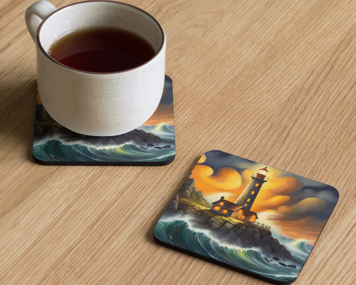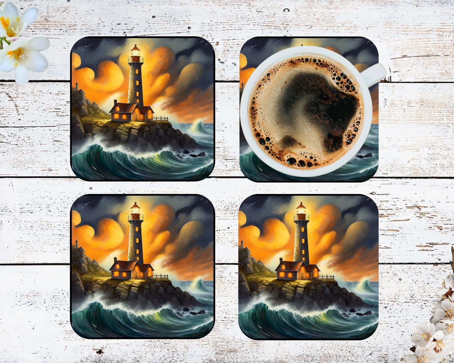 Discover these digital coasters featuring a vibrant lighthouse at sunset, perfect for decorating your tables with unique and warm art. Bring your space to life and download now to print and enjoy at home!