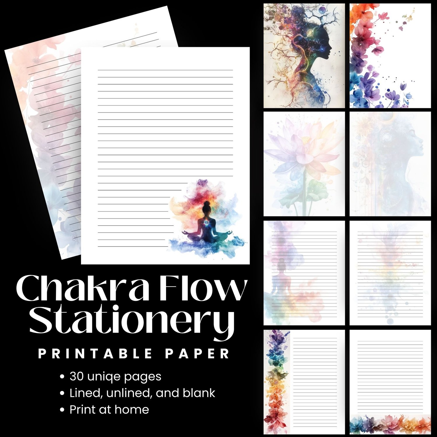 Chakra Printable Stationery – Digital Letter Paper for Journaling, Yoga, and Note Taking
