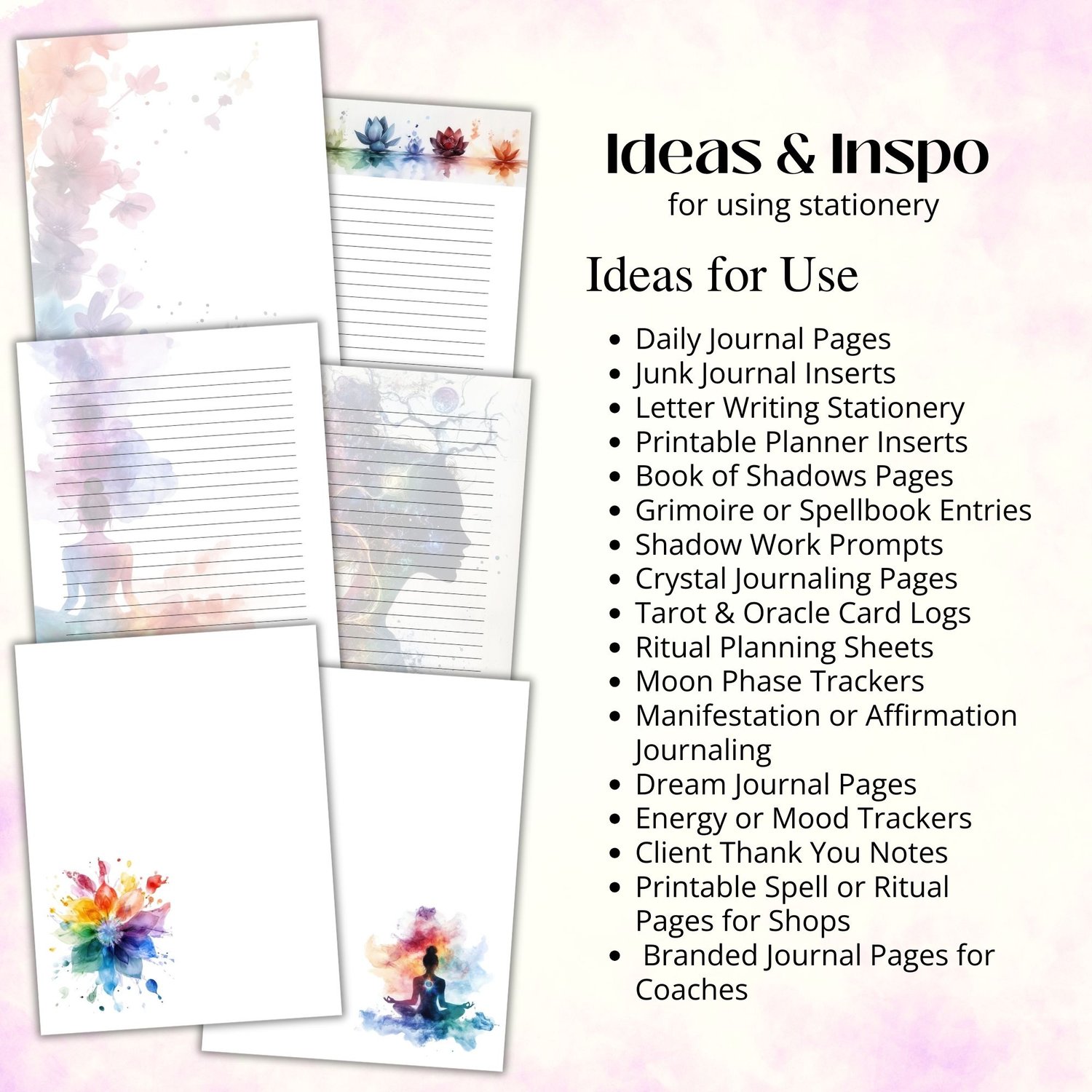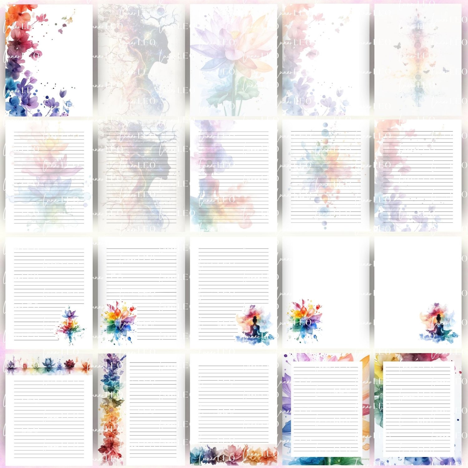 This chakra-themed printable stationery set features beautifully illustrated chakra flowers across 30 digital pages, designed to support mindful writing, personal reflection, and spiritual connection. Each page is available in lined, unlined, and blank formats, making it easy to use for letter writing, journaling, or custom stationery kits.