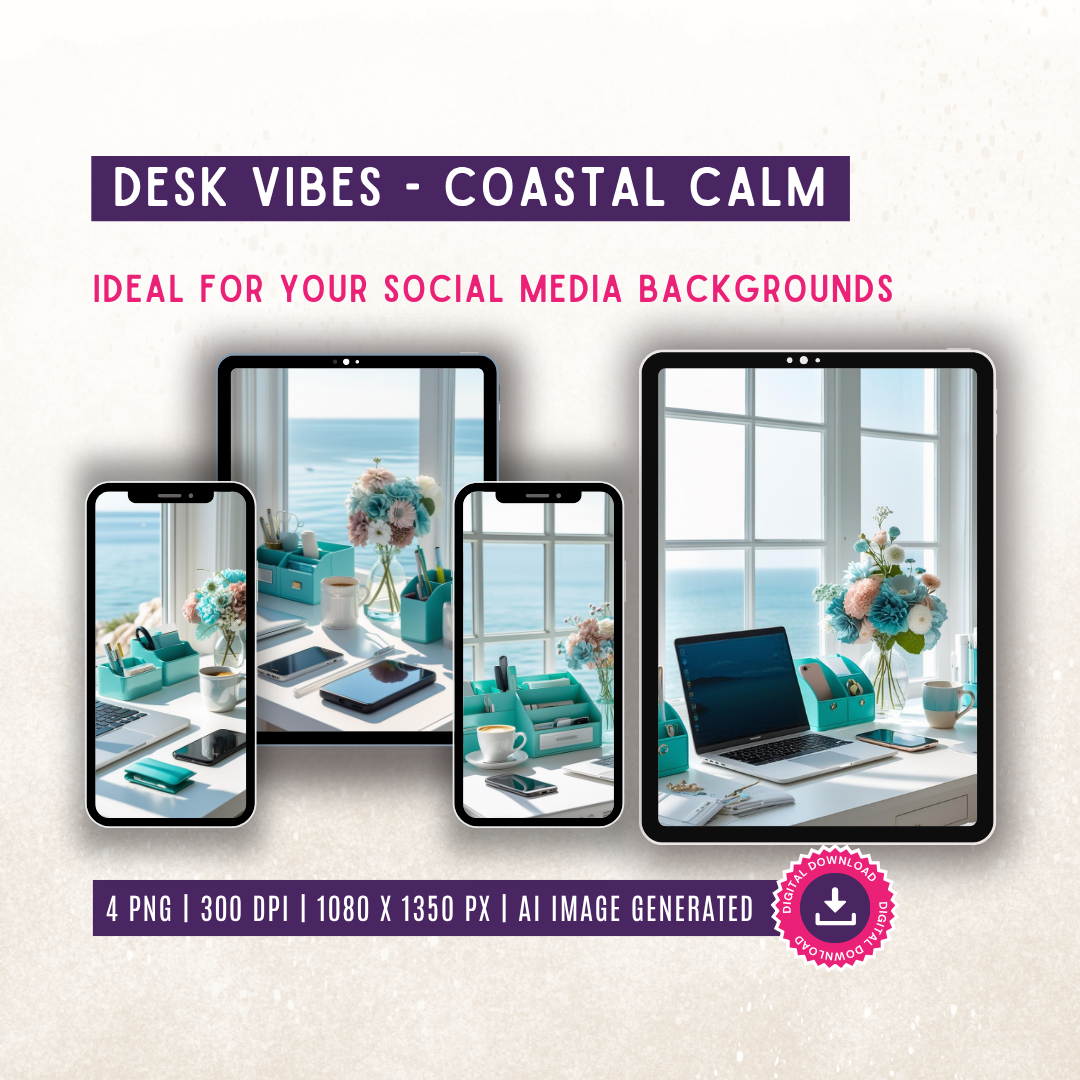Desk Vibes – Coastal Calm AI Image Pack – 4 Social Media Backgrounds