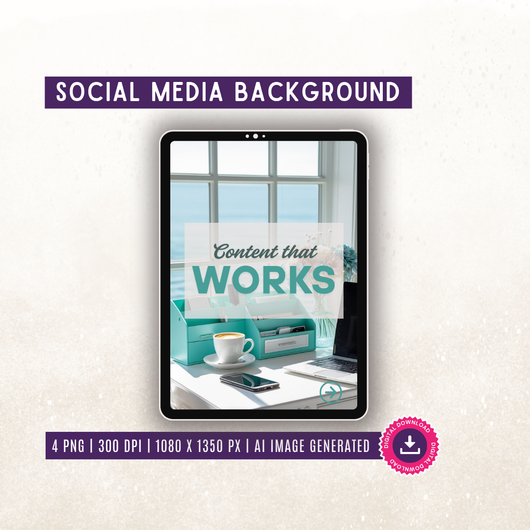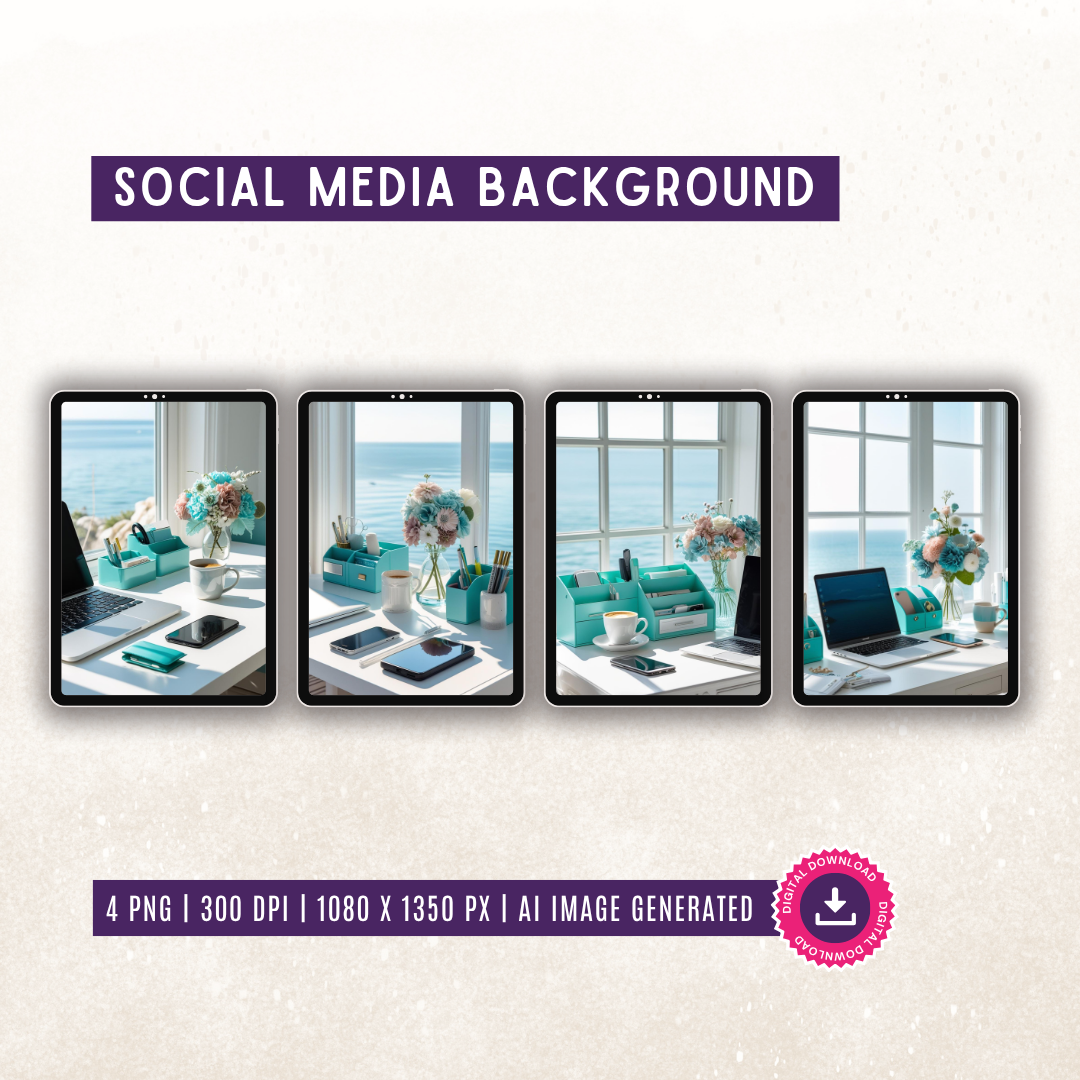 Bring a breezy, calming touch to your content with this serene set of coastal-inspired AI images. Featuring a clean white desk styled with teal accessories, soft pastel florals, and a peaceful sea view through the window – these stylish backgrounds are perfect for giving your social media posts, planners, or digital products a fresh and tranquil feel.