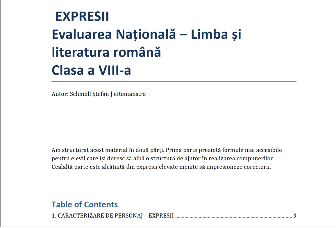 Despre autor: Schmoll Ștefan este profesor de limba și literatura română, fiind printre primii autori de materiale digitale pentru examenele naționale. Activitatea sa debutează în anul 2015 când creează lecții video pe canalul de youtube eromână. De-a lungul timpului a pregătit mii de elevi și a înteles cum trebuie structurată materia pentru a fi expusă elevilor într-un mod logic și prietenos.