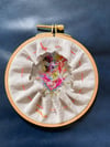 Embroidery of a milagro in Trans pride flag colors with an ojo crying rainbow tears. Designed and embroidered by me May 2022. This embroidery still has a bit of light pencil markings left on it and the price reflects this. To keep from fading be sure to not place in direct sunlight.