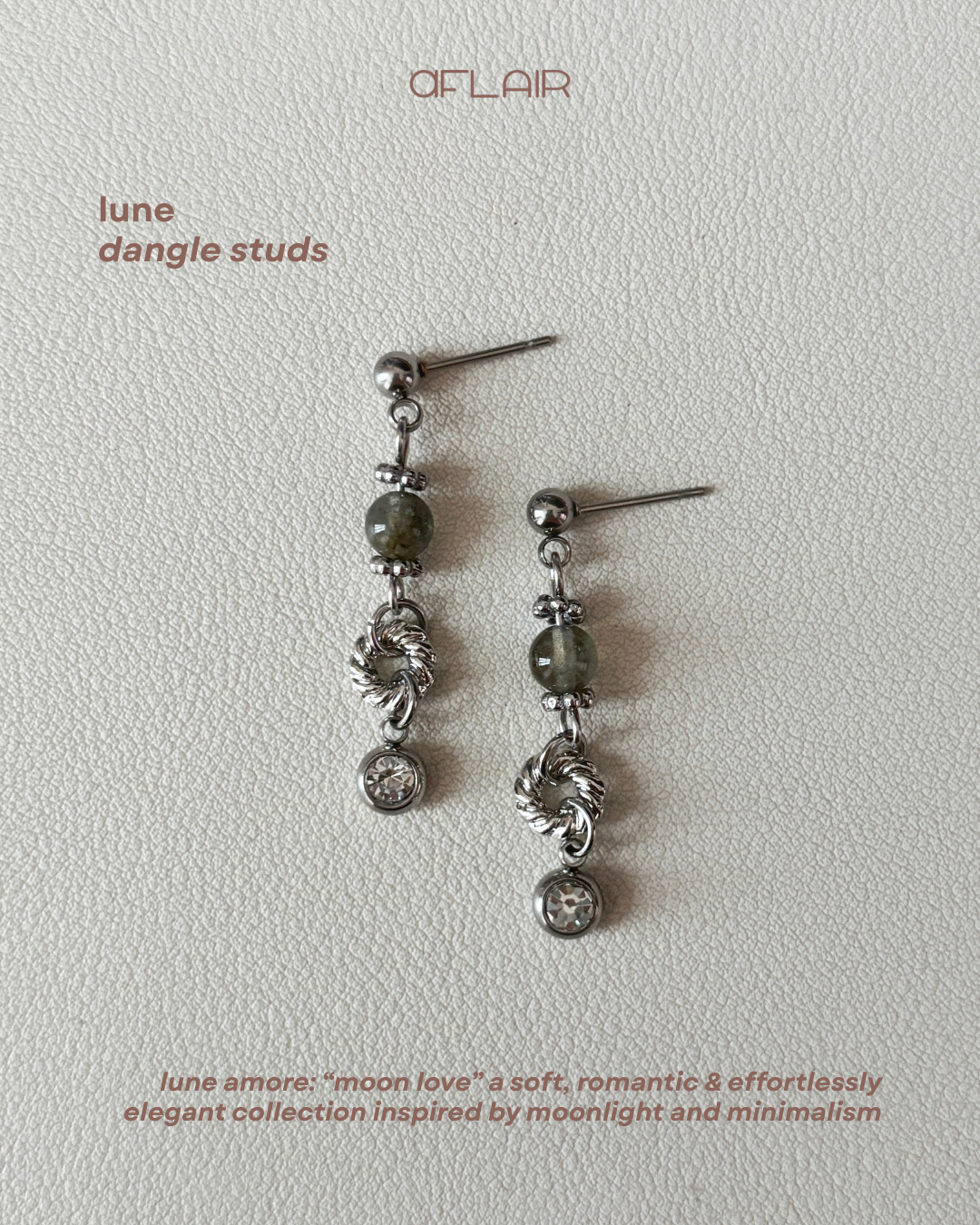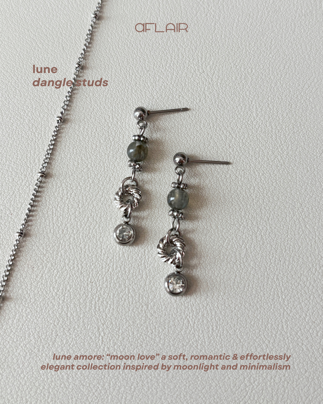 our lune dangle studs combine labradorite gemstones with stainless steel elements, a harmony of softness and strength. subtle yet striking, this piece reflects the gentle glow of moonlight, perfect for those who adore minimalist elegance with a touch of romance. wear it close to you as a reminder of love illuminated by the moon.