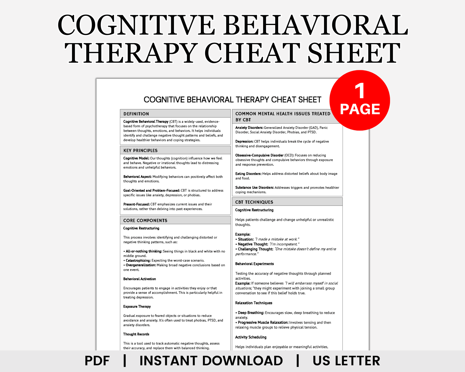 Cognitive Behavioral Therapy Cheat Sheet, CBT Cheat Sheet, CBT Skills, Cognitive Therapy, Psychotherapy, Reference Guide, Counseling Tools