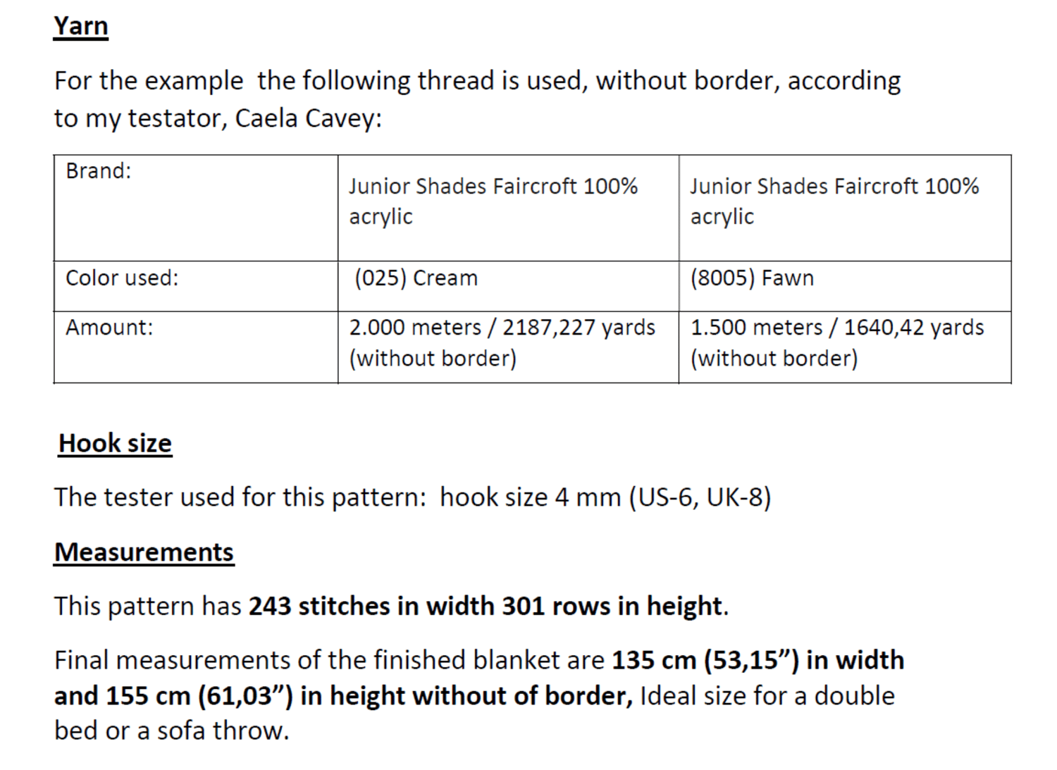 The amount of yarn used for this pattern by my tester without the border was: 2.000 meters / 2187,227 yards (colour 025 Cream of Junior Shades Faircraft yarn) and 1.500 meters / 1640,42 yards (colour 8005 Fawn of Junior Shades Faircraft yarn)