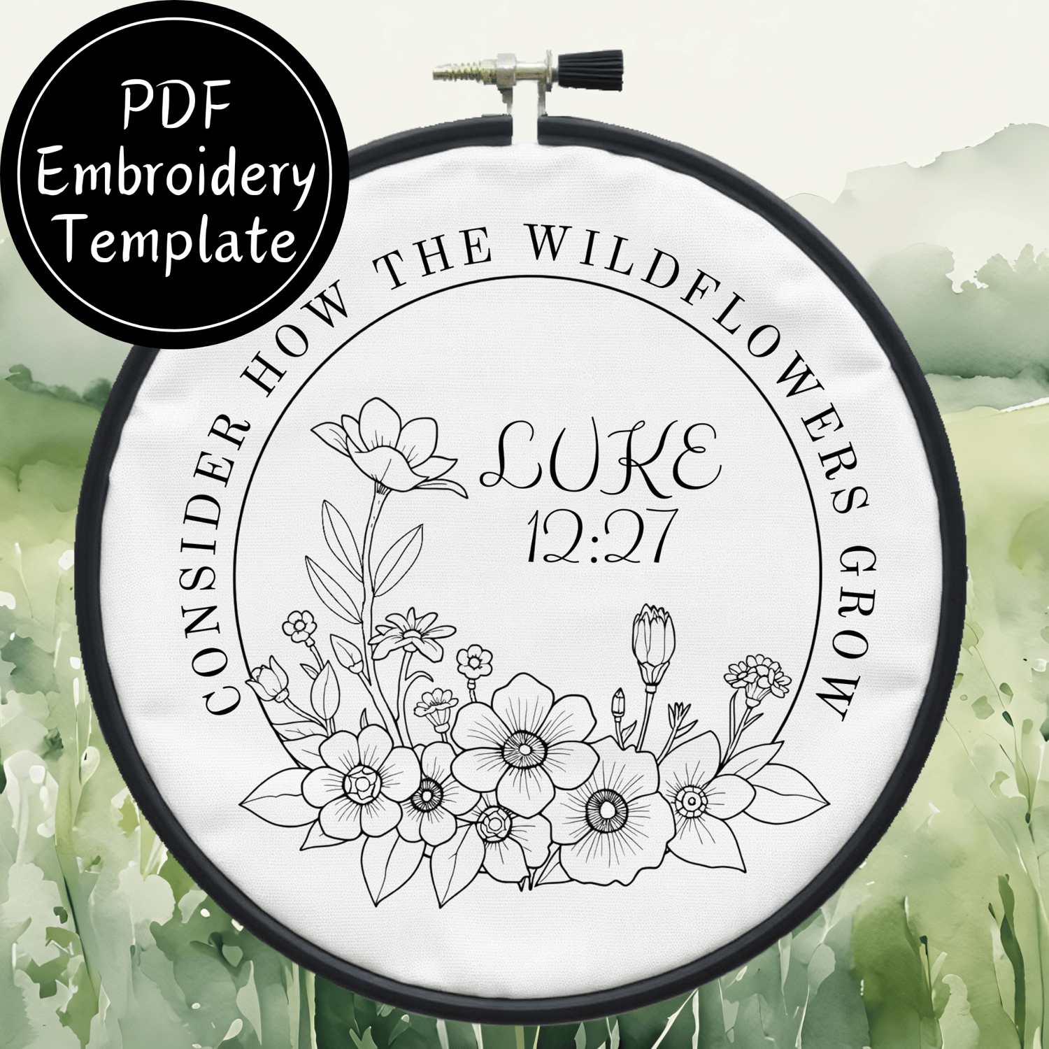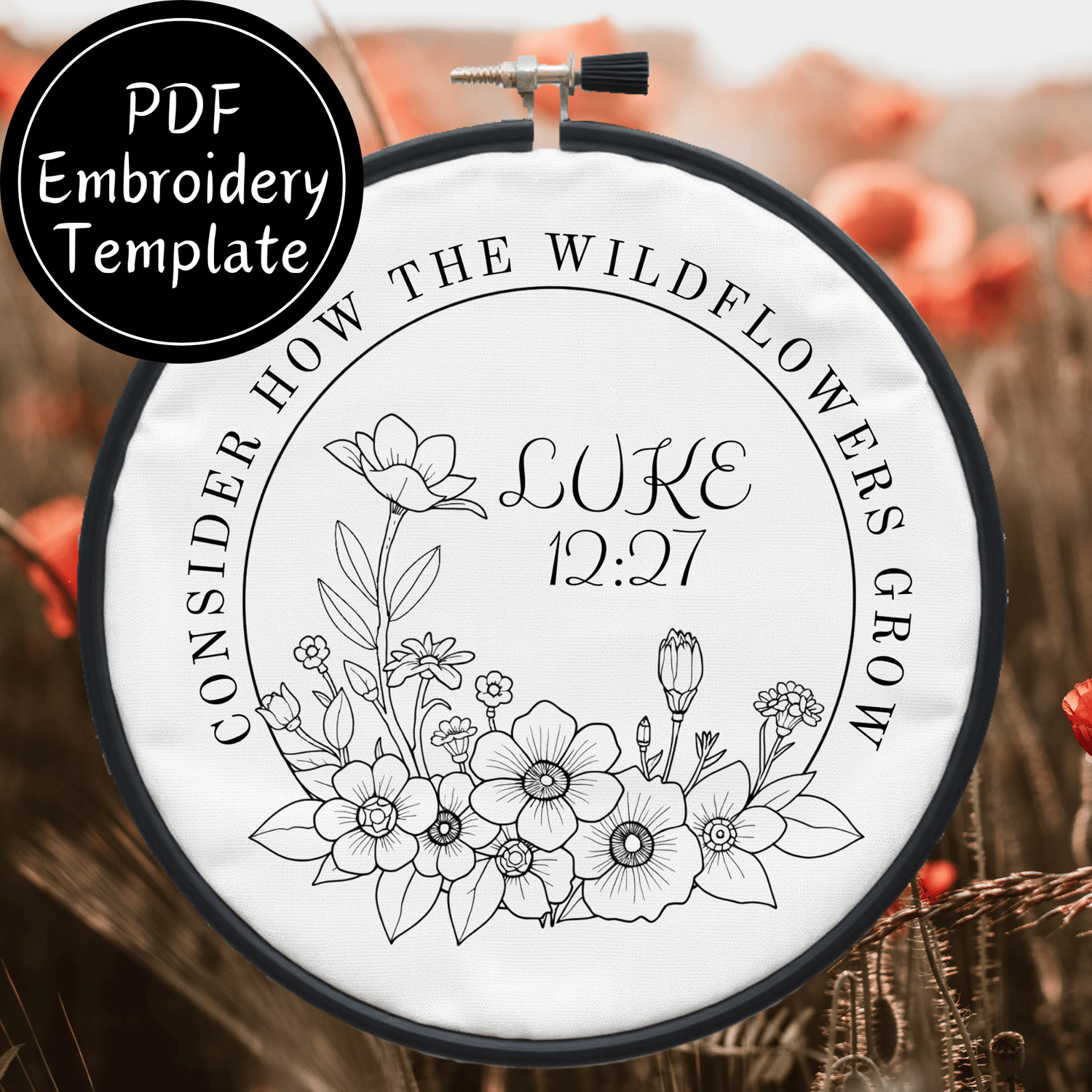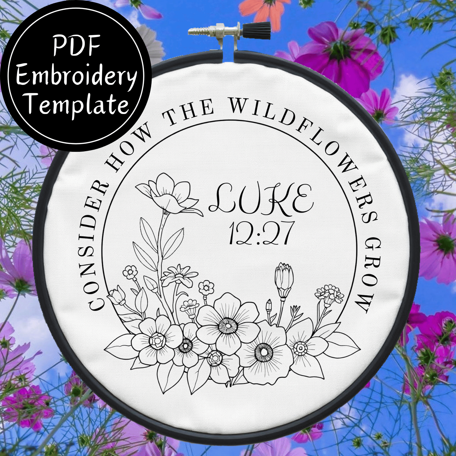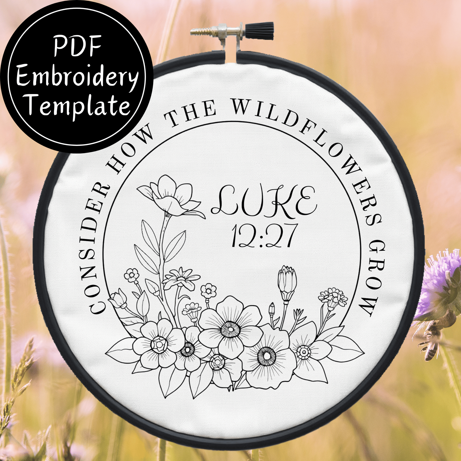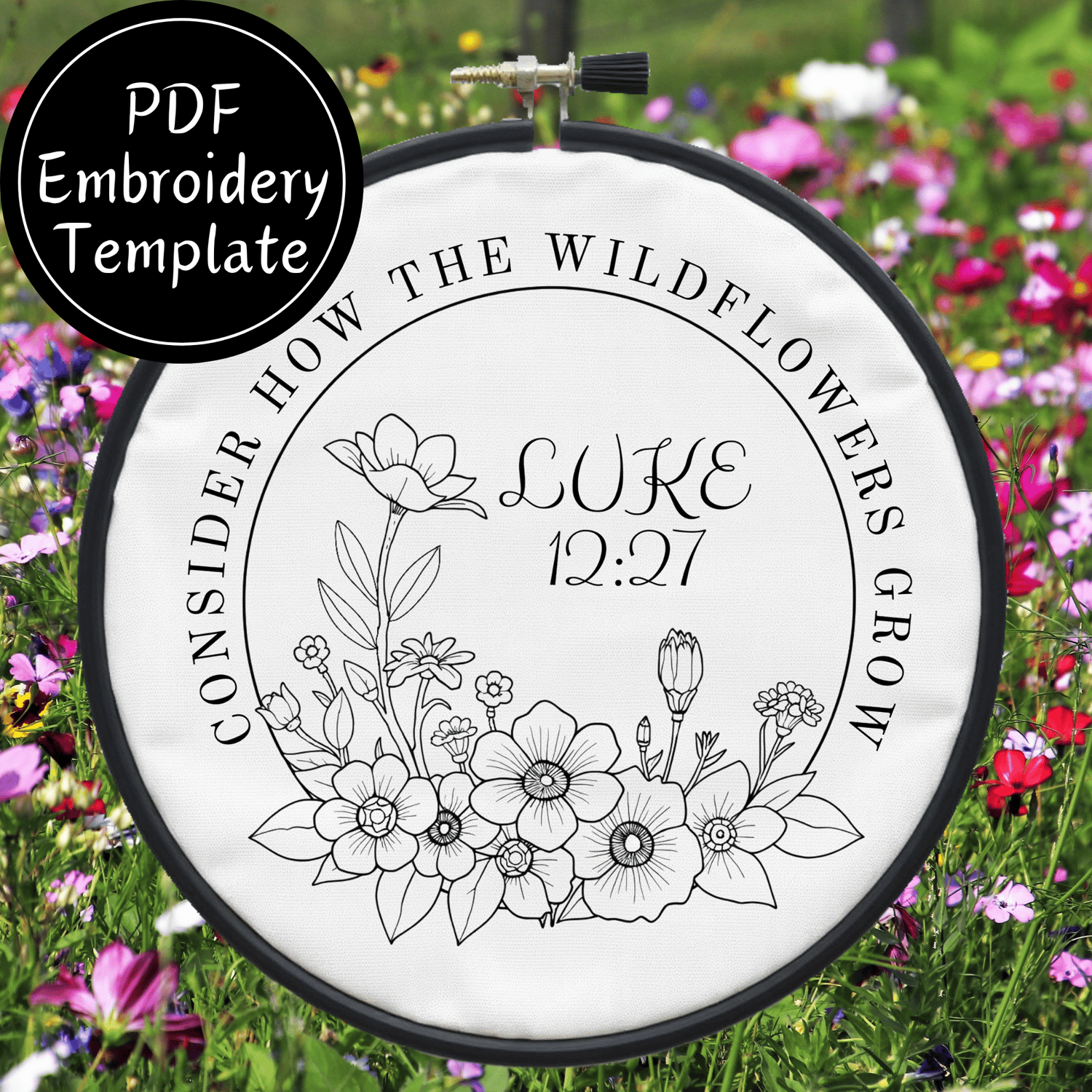 Make this "Consider How The Wildflowers Grow, Luke 12:27", come alive with your choice of colors and stitches to create this simple scripture embroidery pattern.