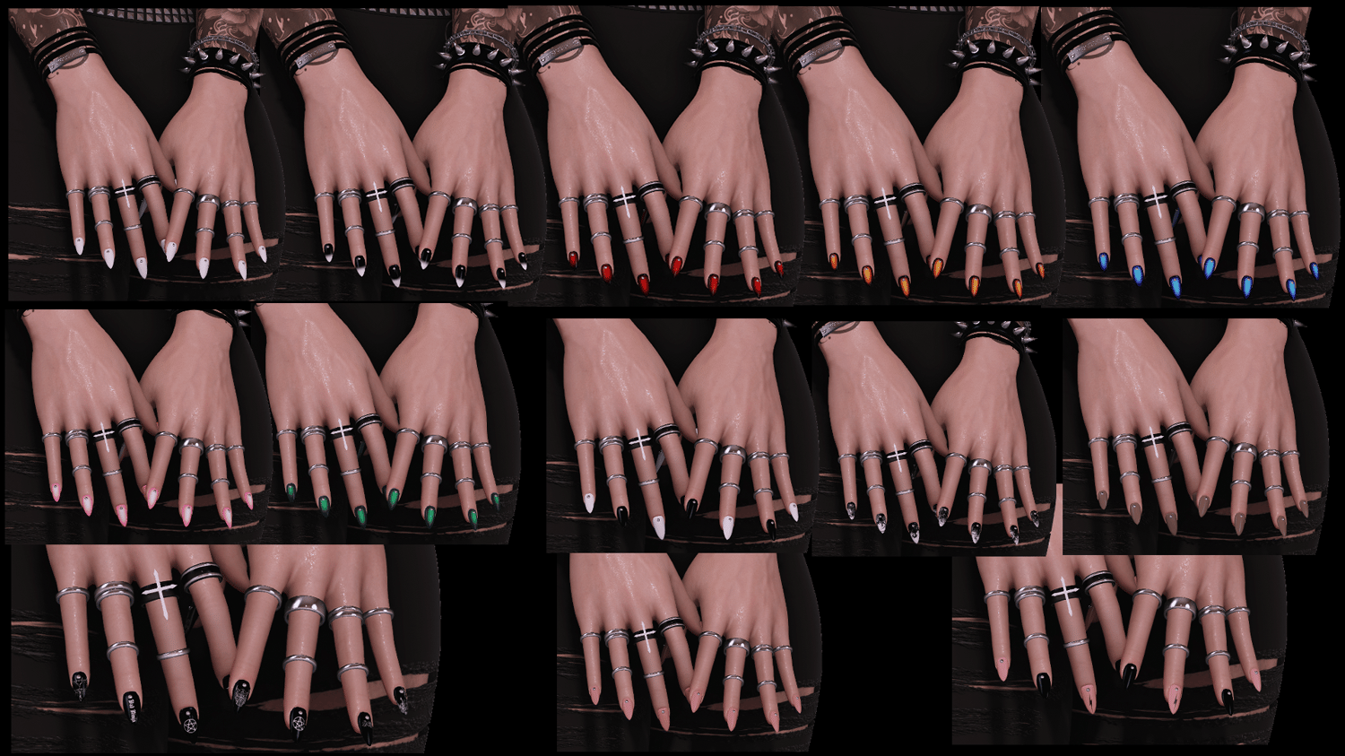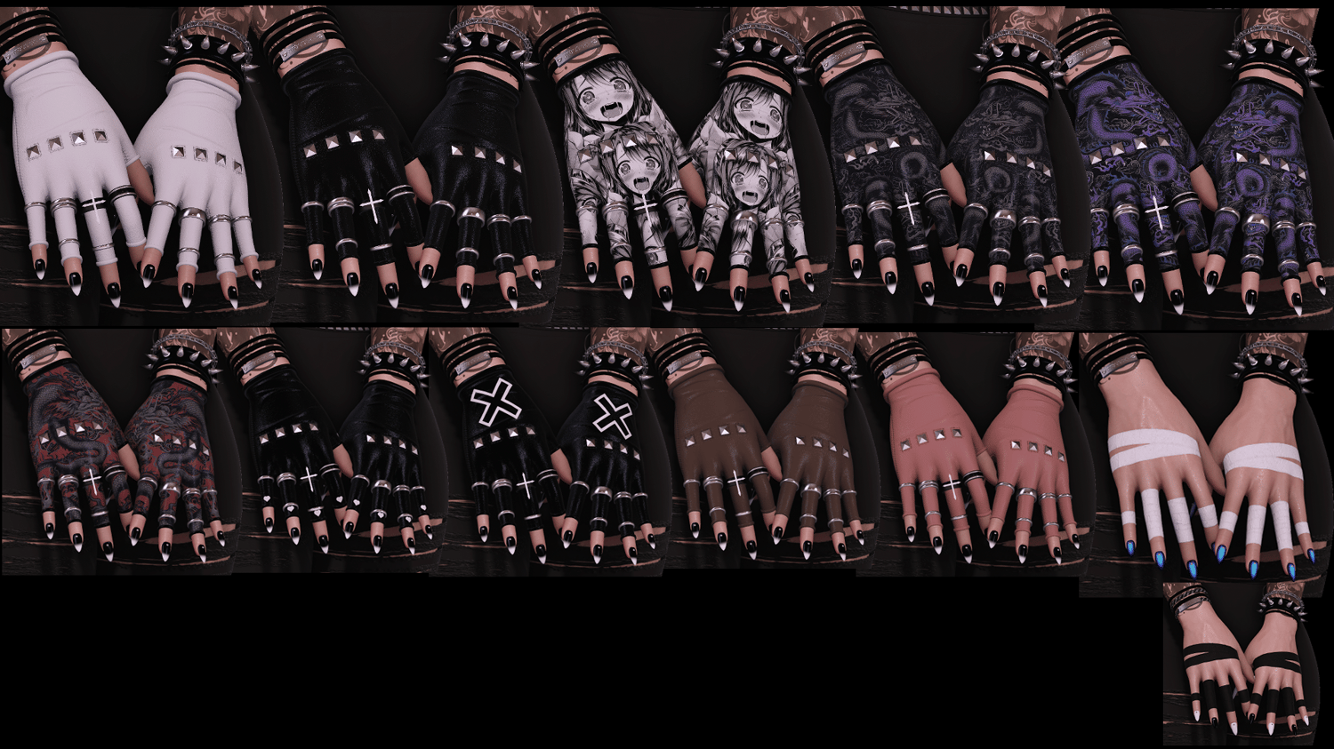 - Hands: Nails are base (several designs). Shuriken, Gloves and Cigarette toggles. Gloves comes in leather and alternative - bandaids/tapes. Mix and match to your liking.