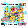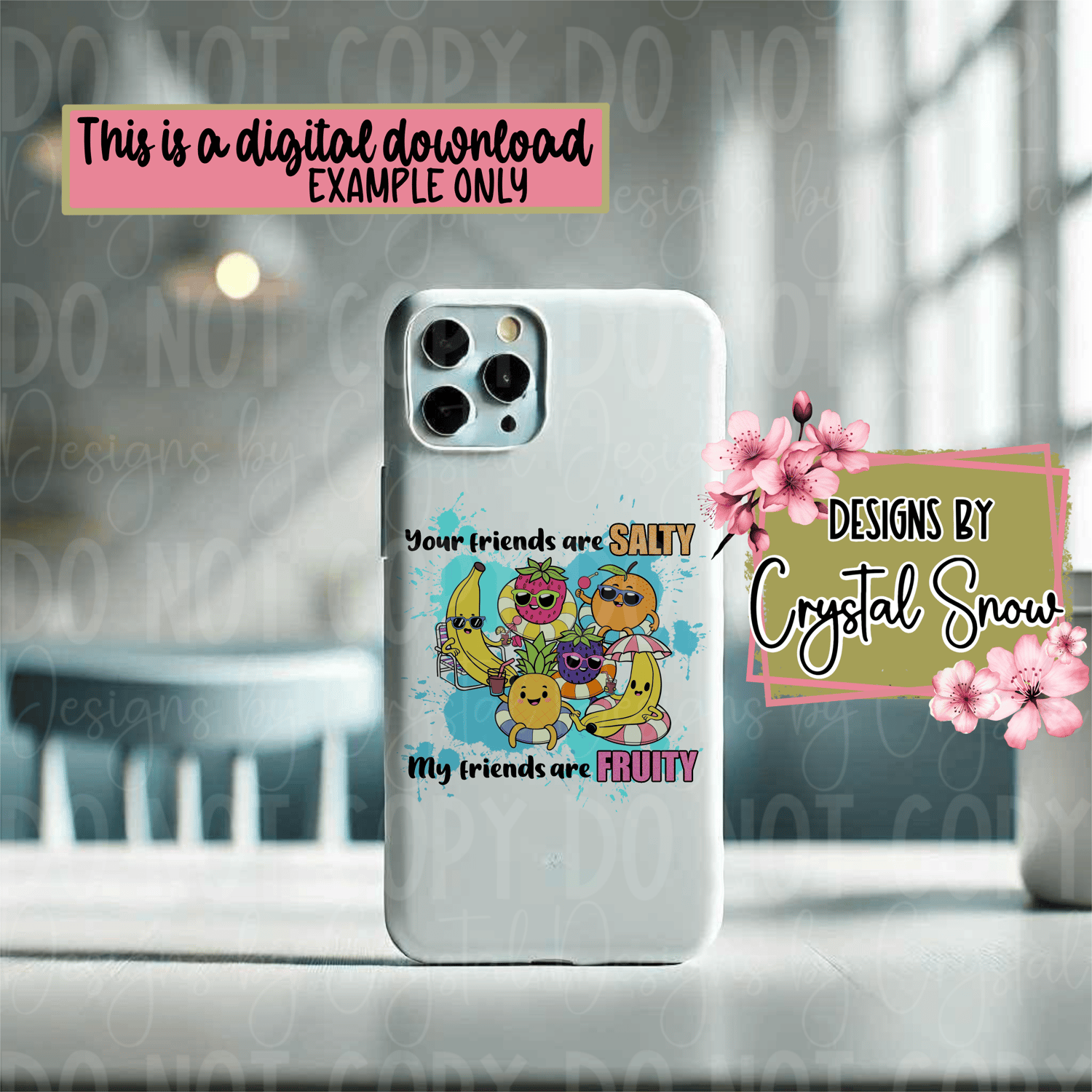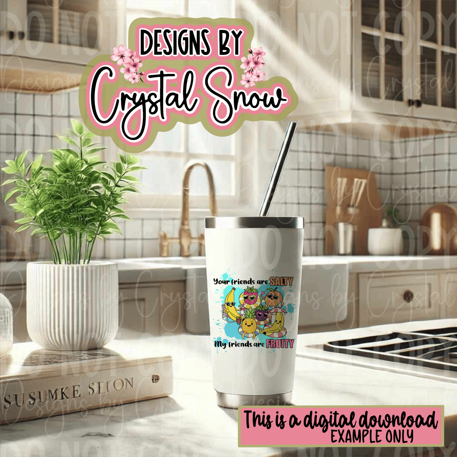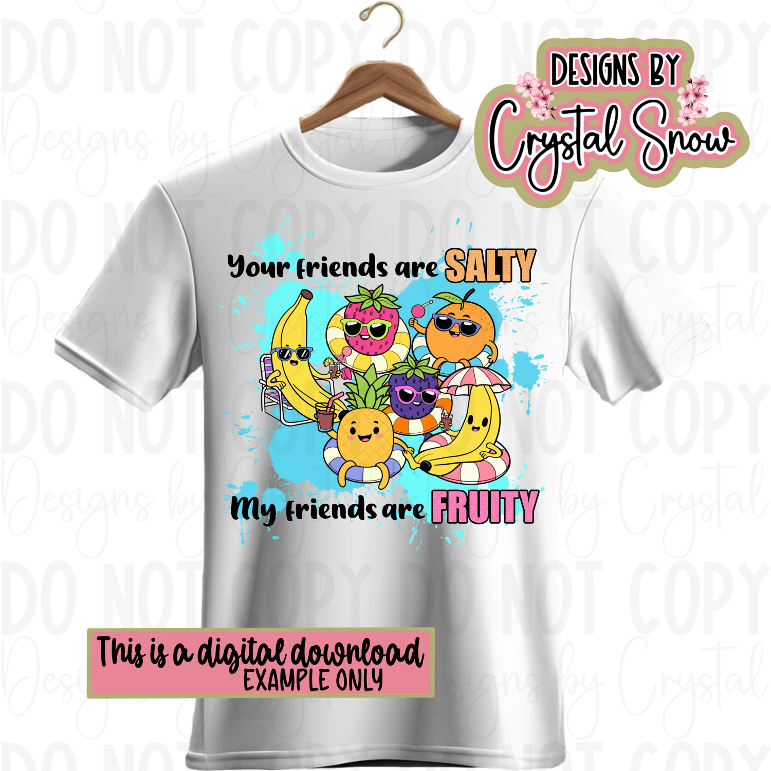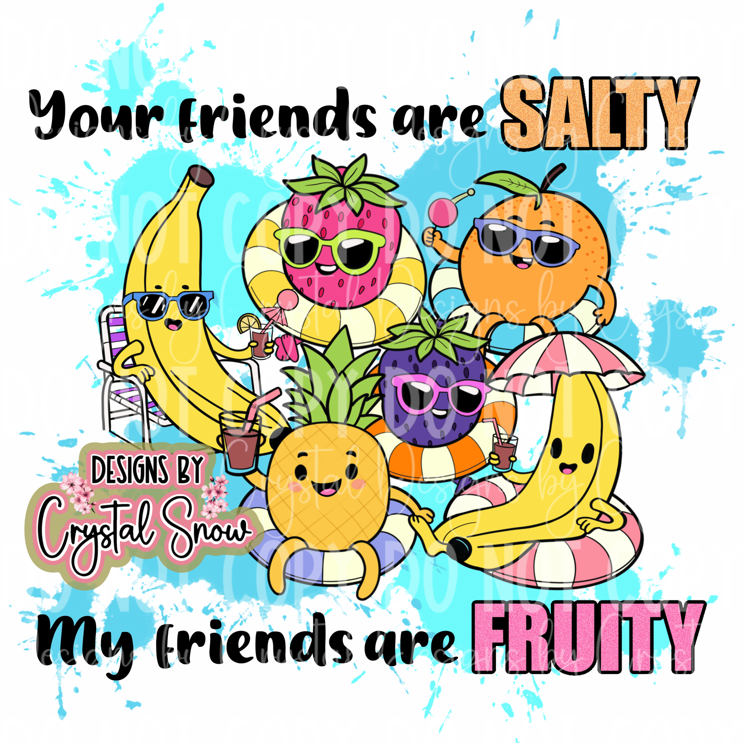 This bright and playful sublimation design features a group of fruit besties — banana, pineapple, strawberry, blueberry, and orange — rocking floaties, drinks, sunglasses, and attitude. With the phrase "My Besties Are Fruity" and a glittery “Salty” accent, this design is perfect for funny summer shirts, tumblers, beach bags, and sticker sets.
