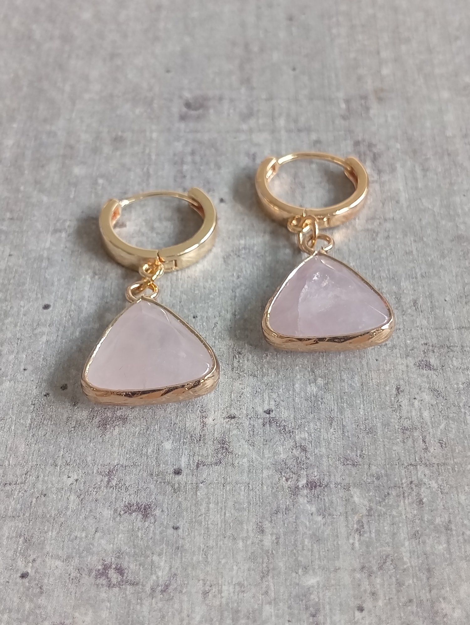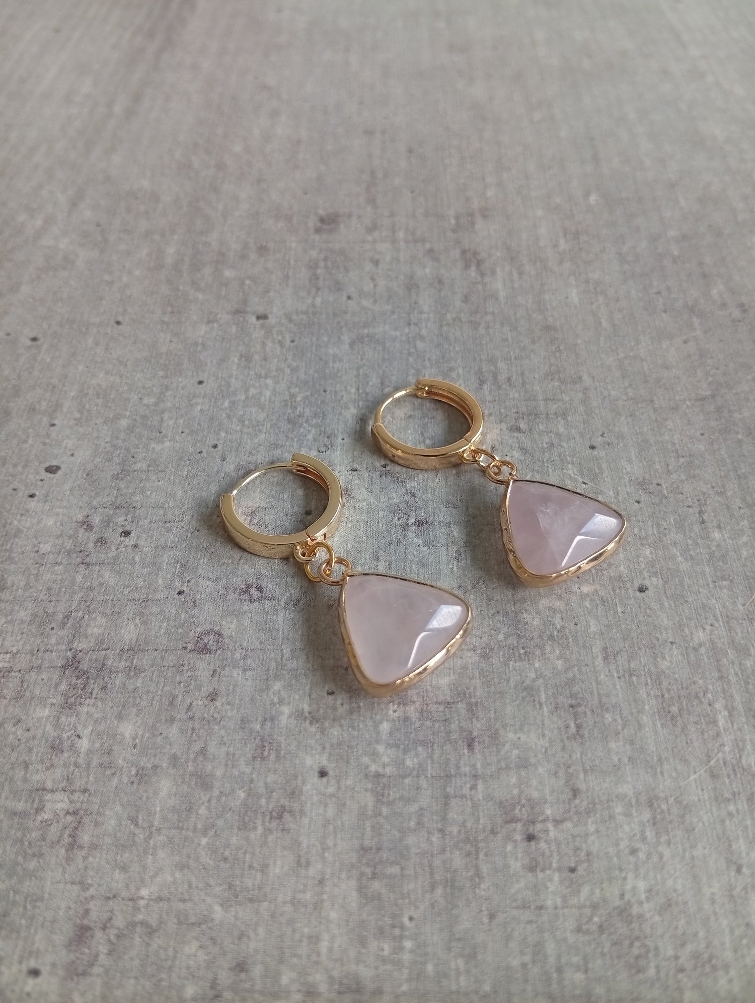 Boucles d’oreilles en quartz rose montées sur attaches dorées. Douces et féminines, elles invitent à l’ouverture du cœur, à l’amour bienveillant et à une présence apaisée à soi.