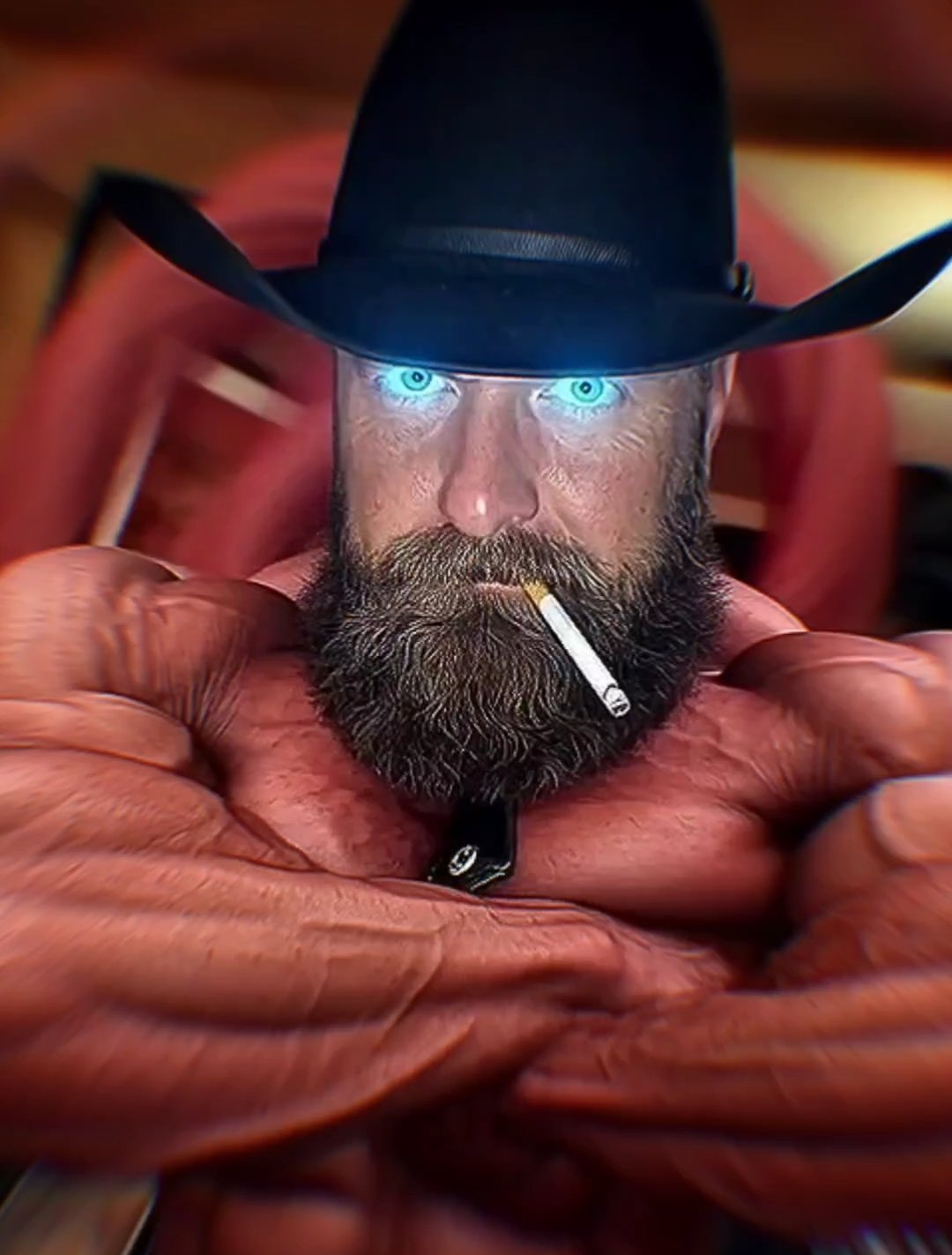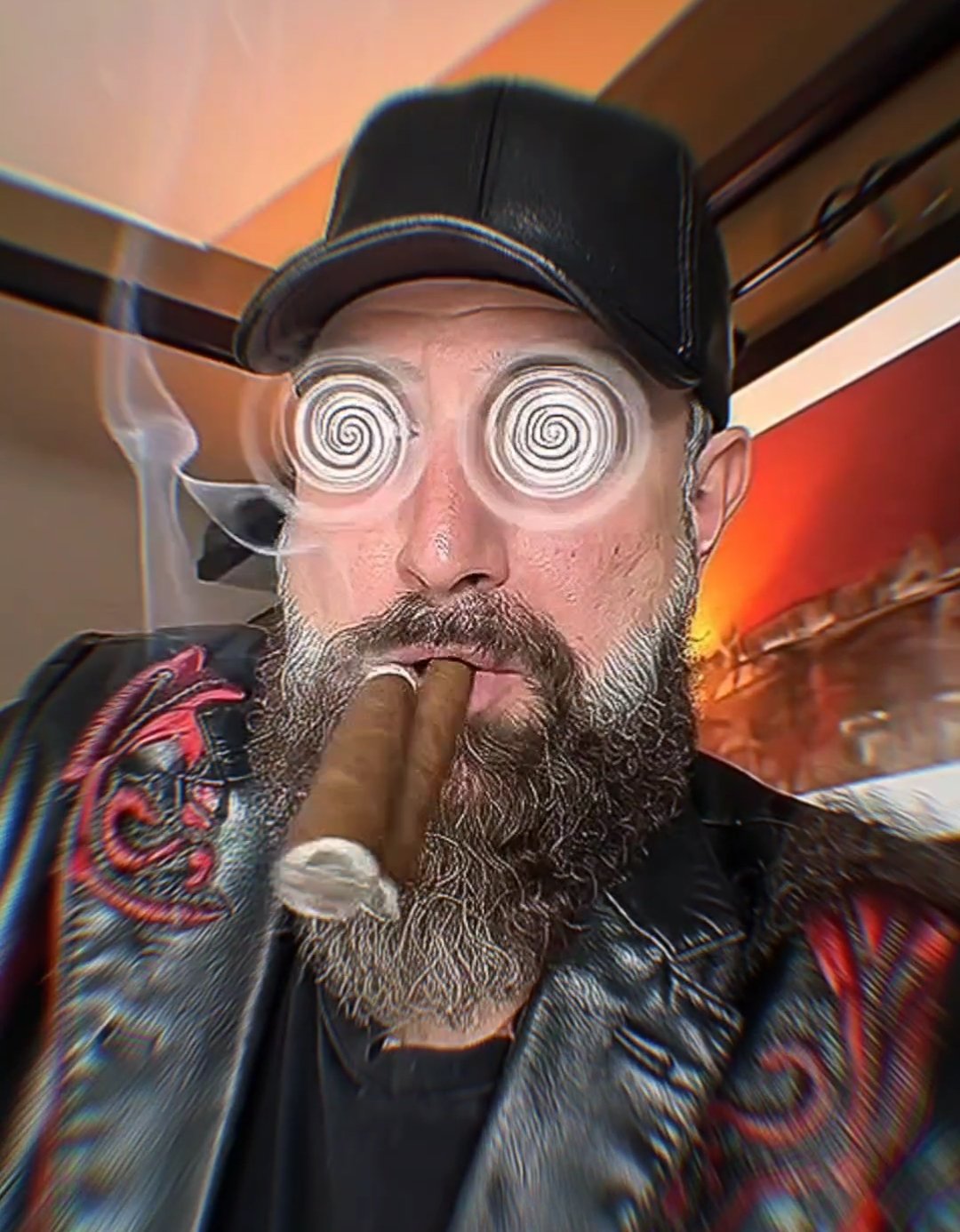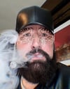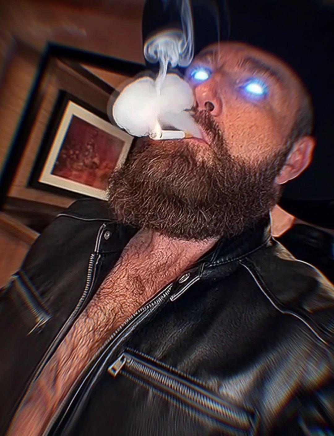 Bearded brainwashing cigar puffing bear sporting different leathers and fur.